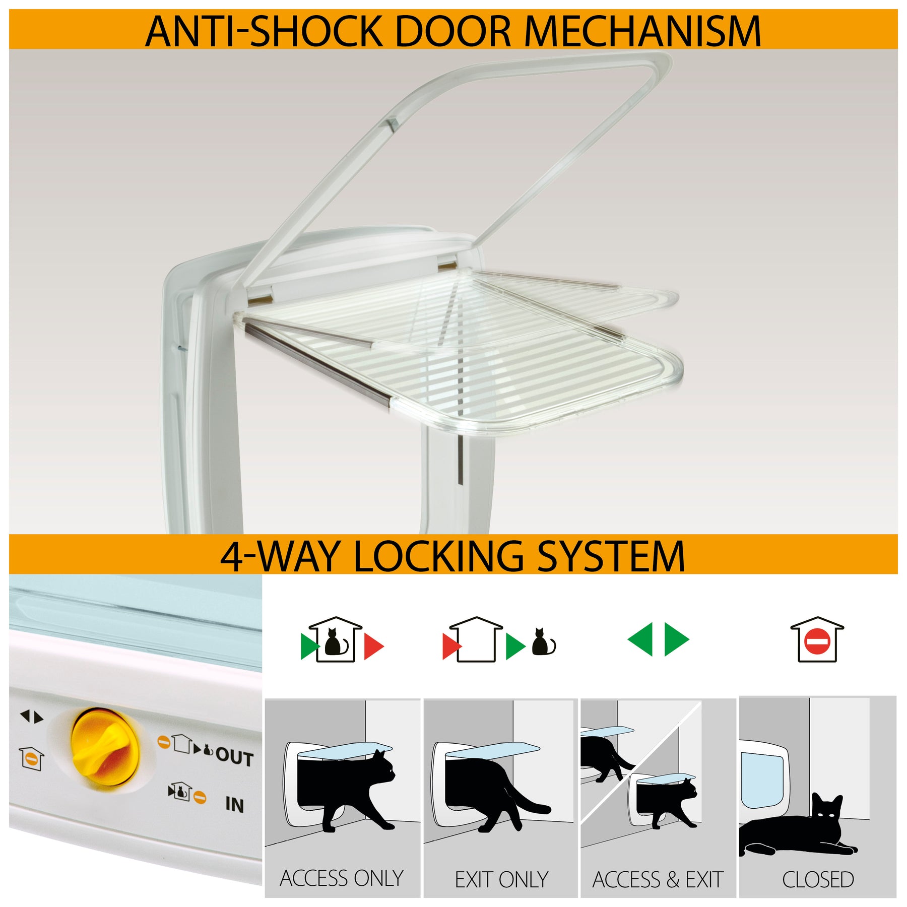 Swing flaps come with the innovative Wind Stopper System, which is a system of protection against draughts (except for the Swing 1 and 3 models). Another important feature is the 4-way locking system (not present in the Swing 1 model) that allows you to adjust the type of opening according to your needs: entry only, exit only, entry and exit, or closed. Lastly, a passage indicator (provided with Swing 5 and 7) will help you to understand whether your pet is indoors or out and consists of a flag, placed on the bottom of the pet flap, which will face the direction in which your furry friend last went. All larger flaps come with a tunnel of 5 cm, allowing them to be adapted to any structure and can be trimmed (the tunnel must not be trimmed in the models Swing 7 and Swing Microchip since they contain a very delicate mechanism).