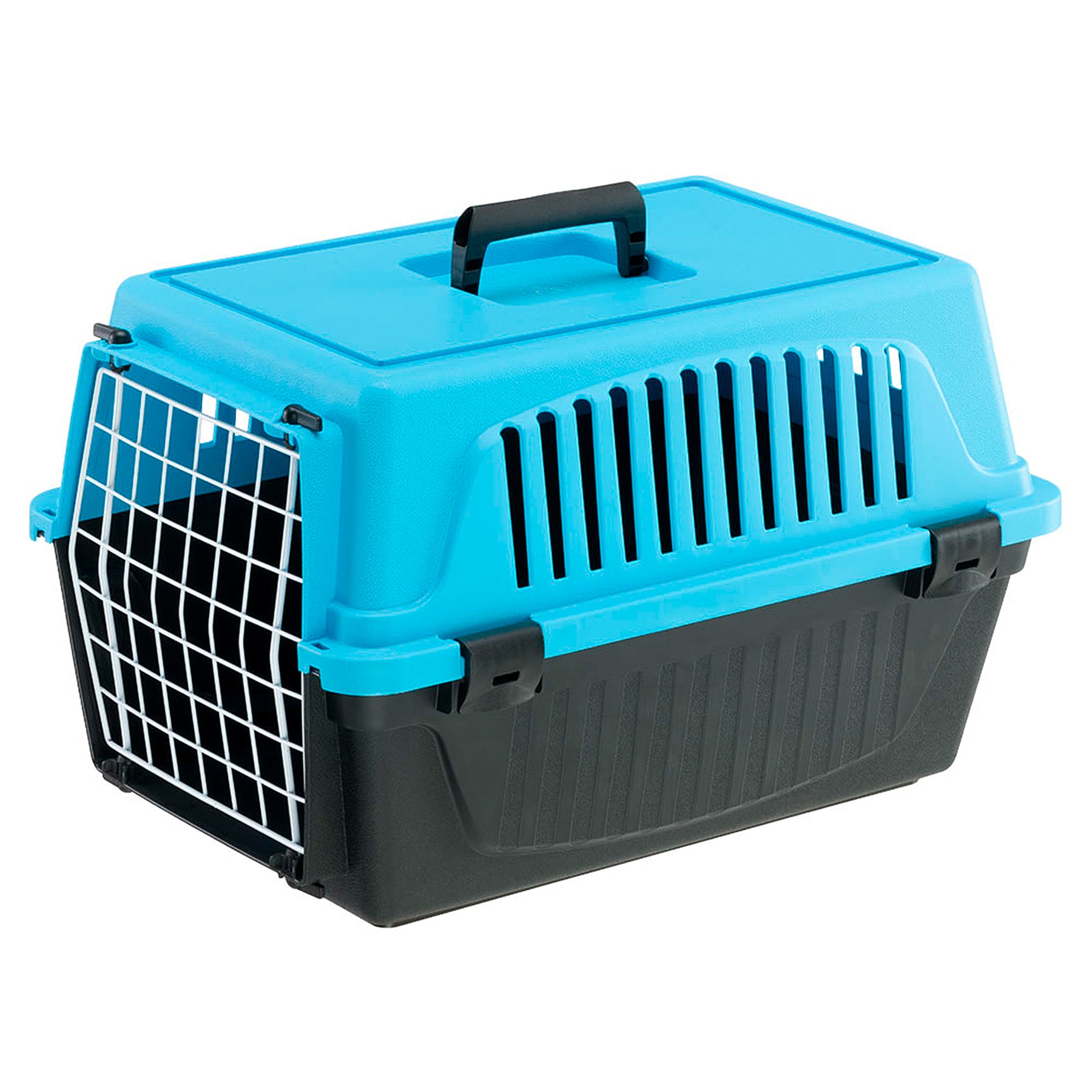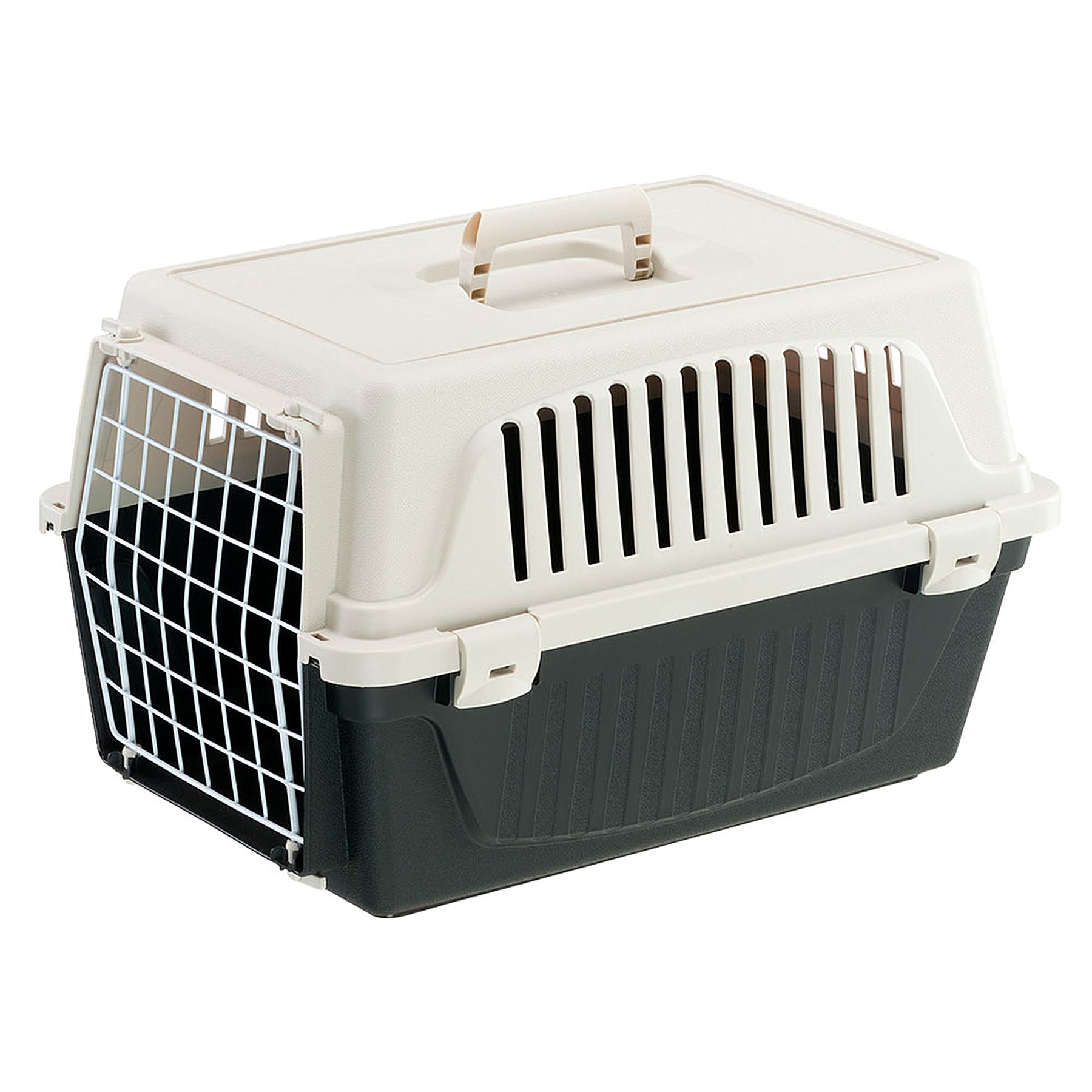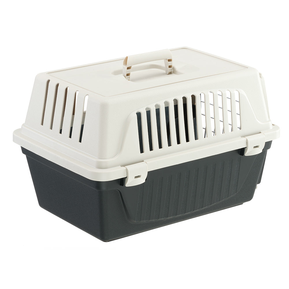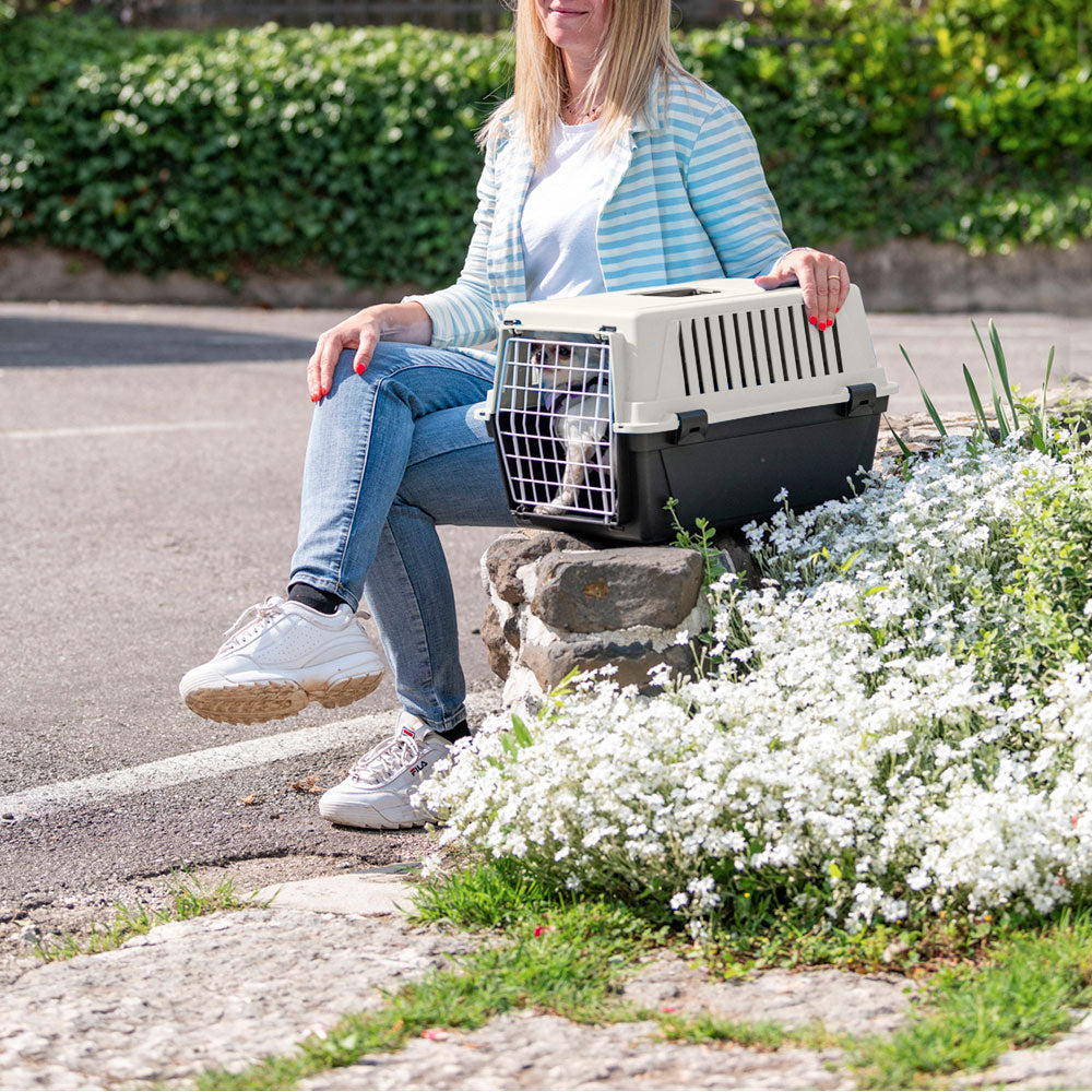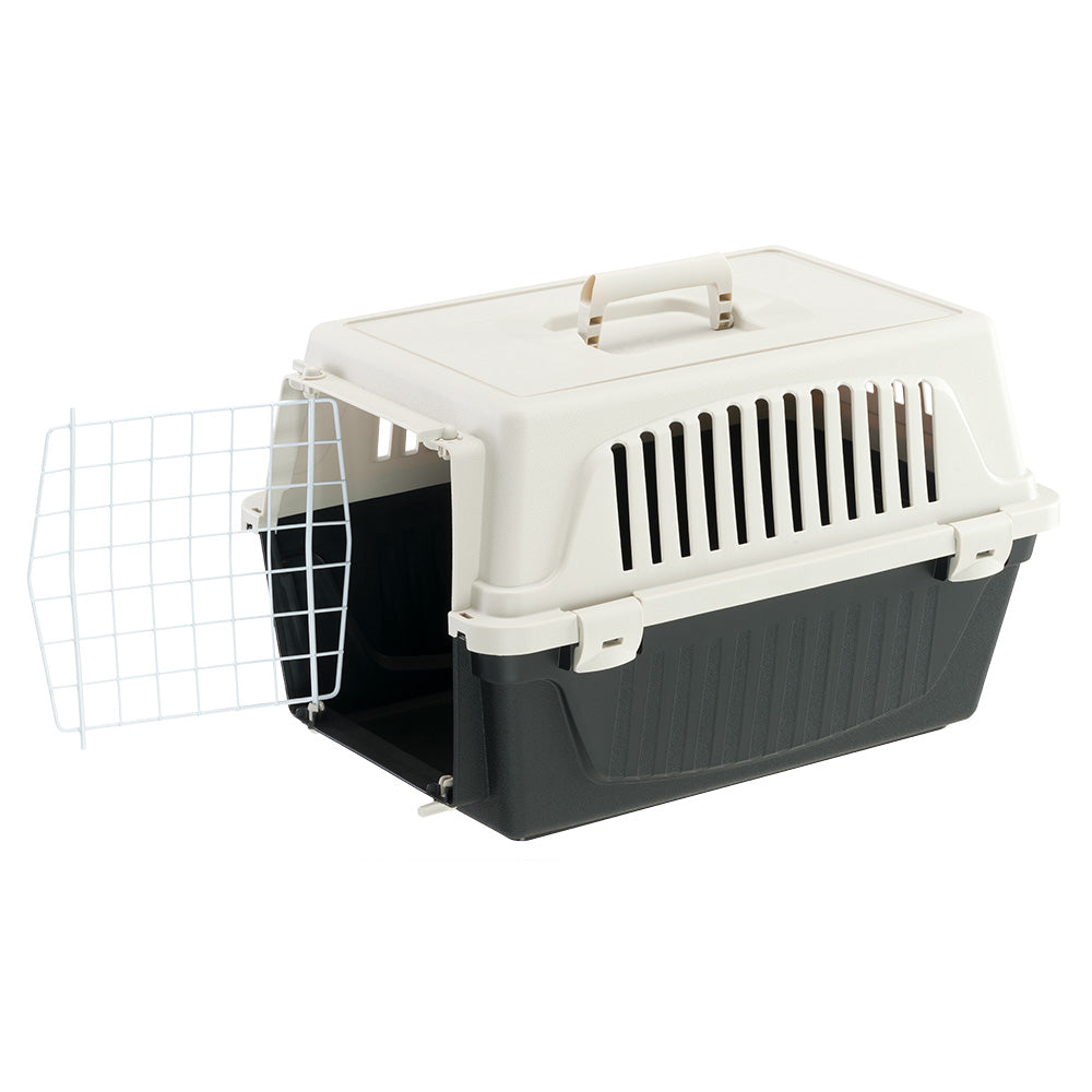 Atlas EL is the most basic version of our pet carriers for cats and small dogs and has multiple functions. Atlas EL is easy to carry with you, thanks to its fixed handle, and is ideal for travelling with your pets on the most common means of transport (car, train, ship, aircraft). This plastic pet carrier for cats and small dogs comes complete with a solid door made of plastic-coated iron. It is very sturdy, thanks to its fastening system with lateral spring clips. It also has lateral ventilation grilles, which ensure sufficient ventilation inside the carrier.