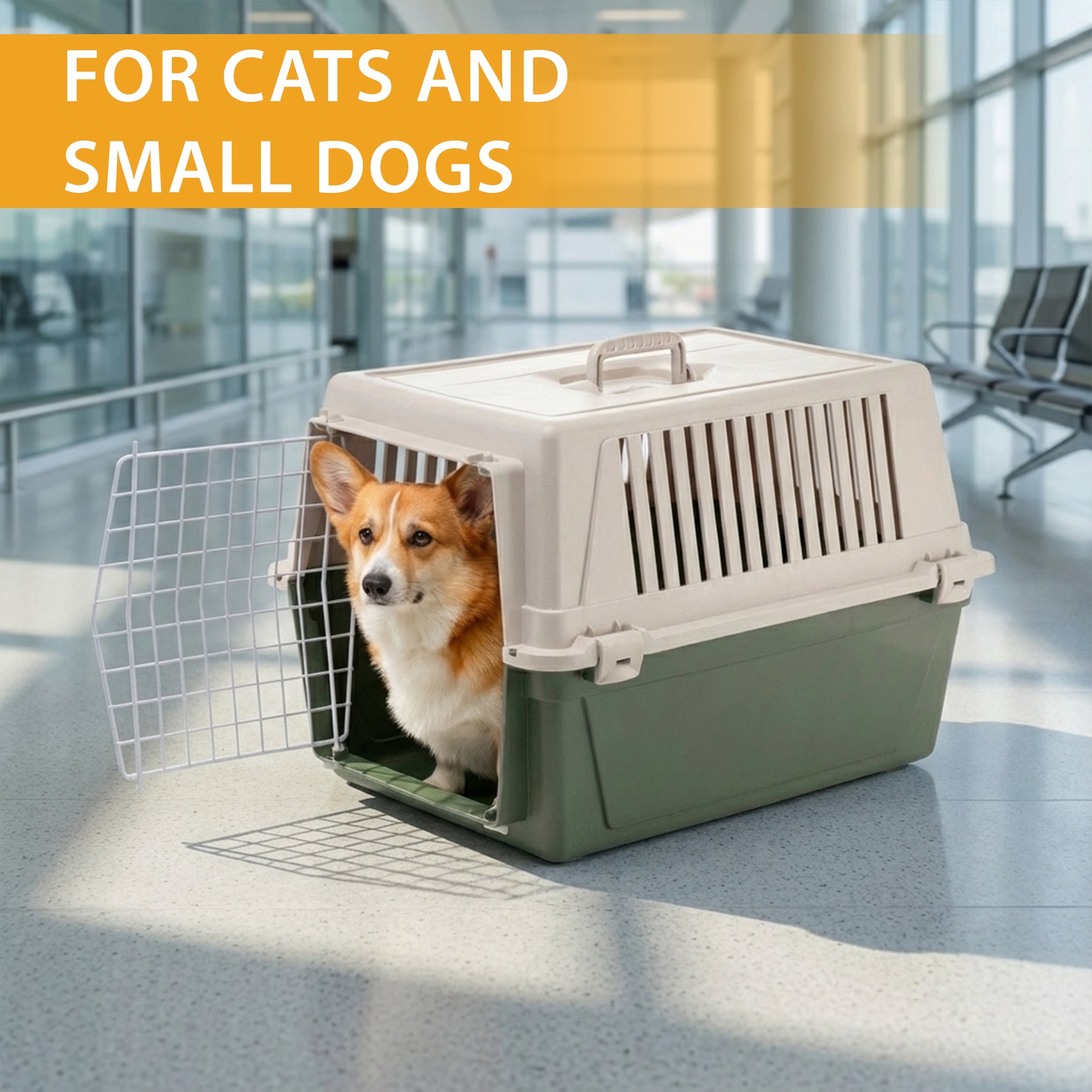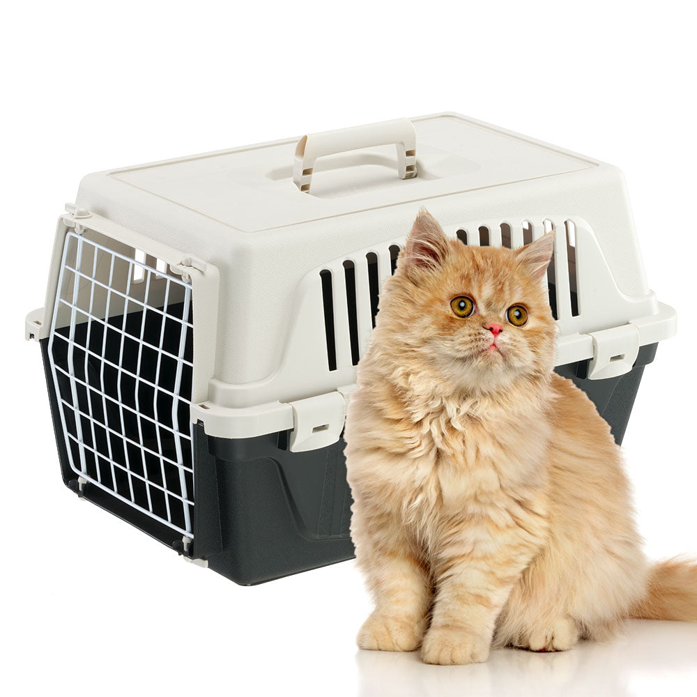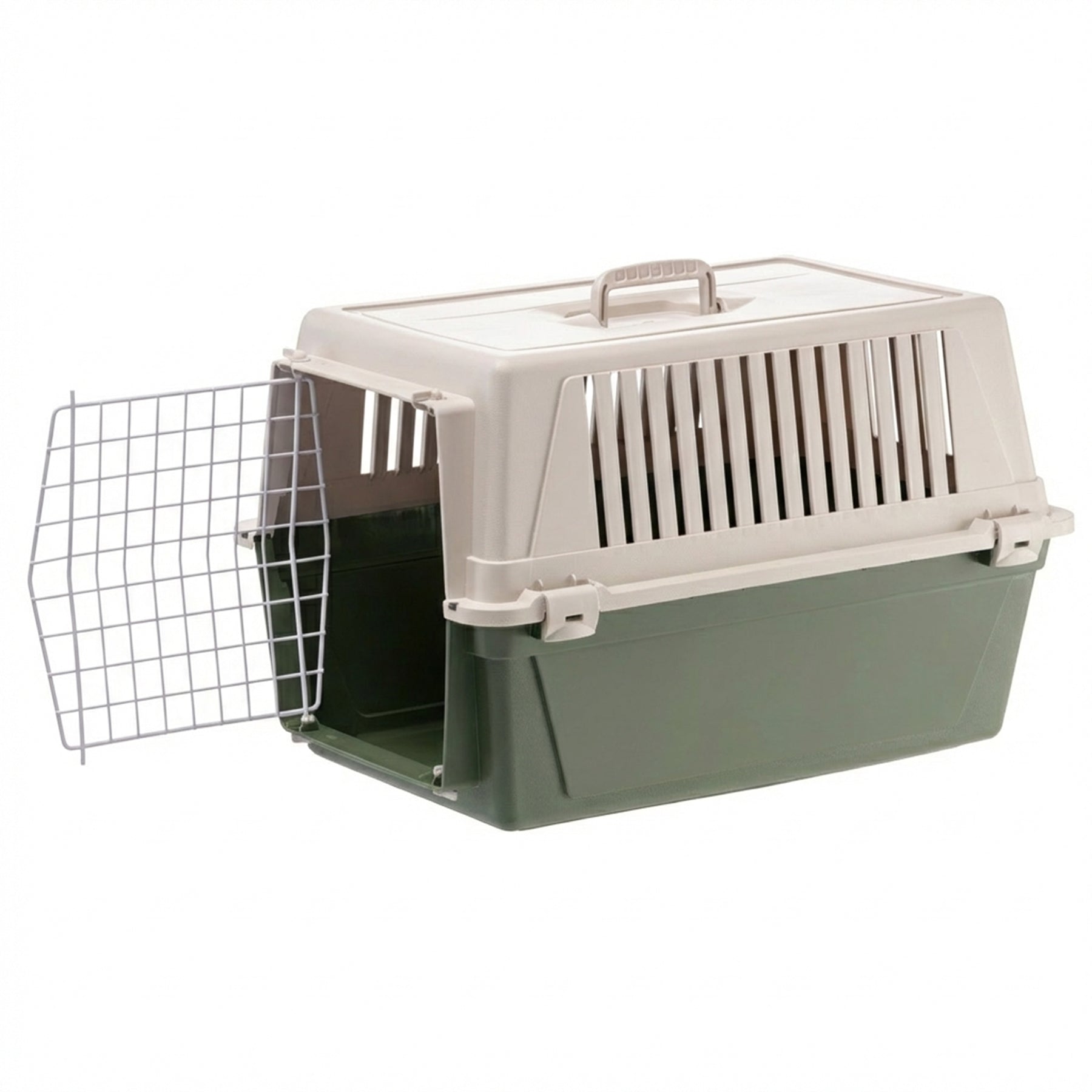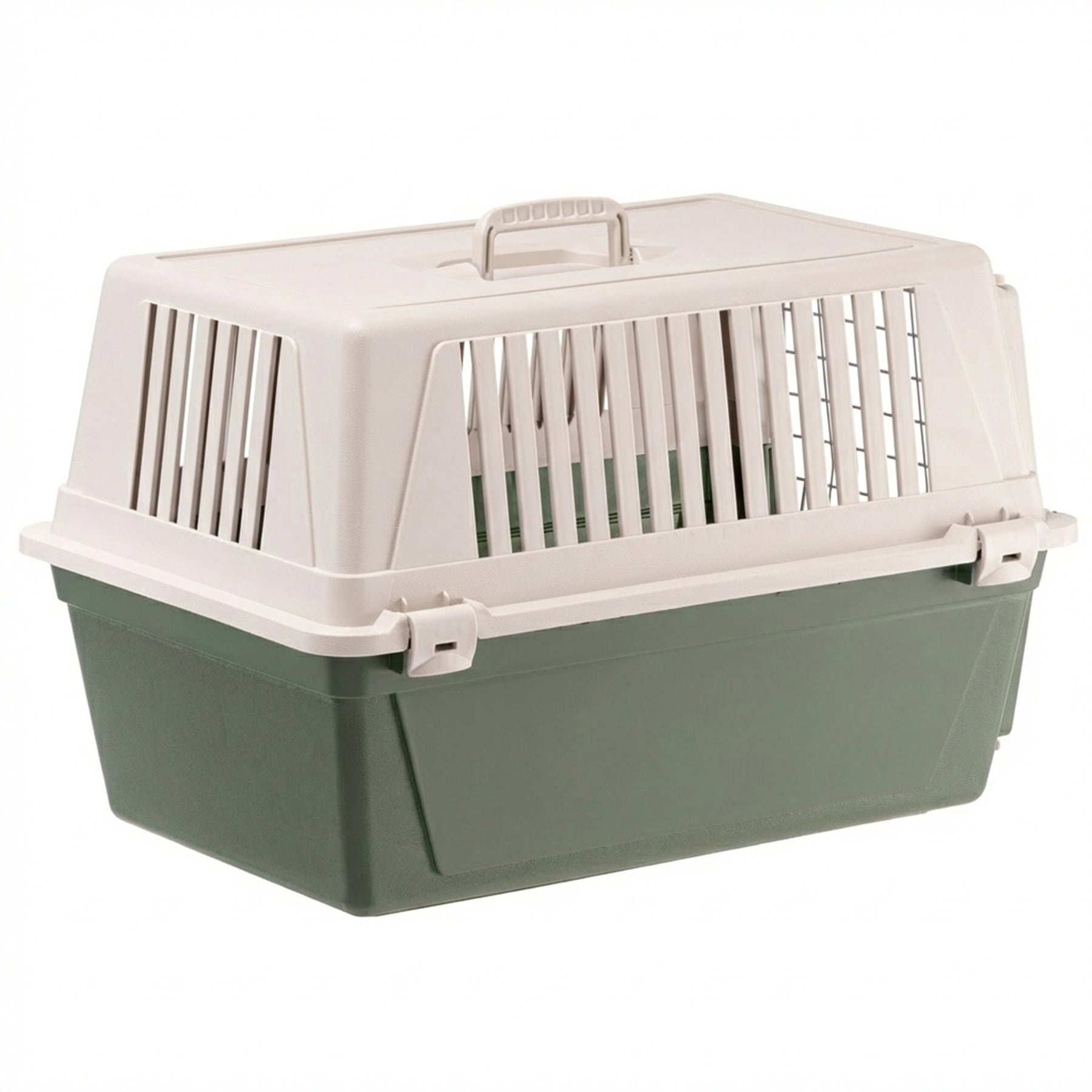 Atlas EL is the most basic version of our pet carriers for cats and small dogs and has multiple functions. Atlas EL is easy to carry with you, thanks to its fixed handle, and is ideal for travelling with your pets on the most common means of transport (car, train, ship, aircraft). This plastic pet carrier for cats and small dogs comes complete with a solid door made of plastic-coated iron. It is very sturdy, thanks to its fastening system with lateral spring clips. It also has lateral ventilation grilles, which ensure sufficient ventilation inside the carrier.