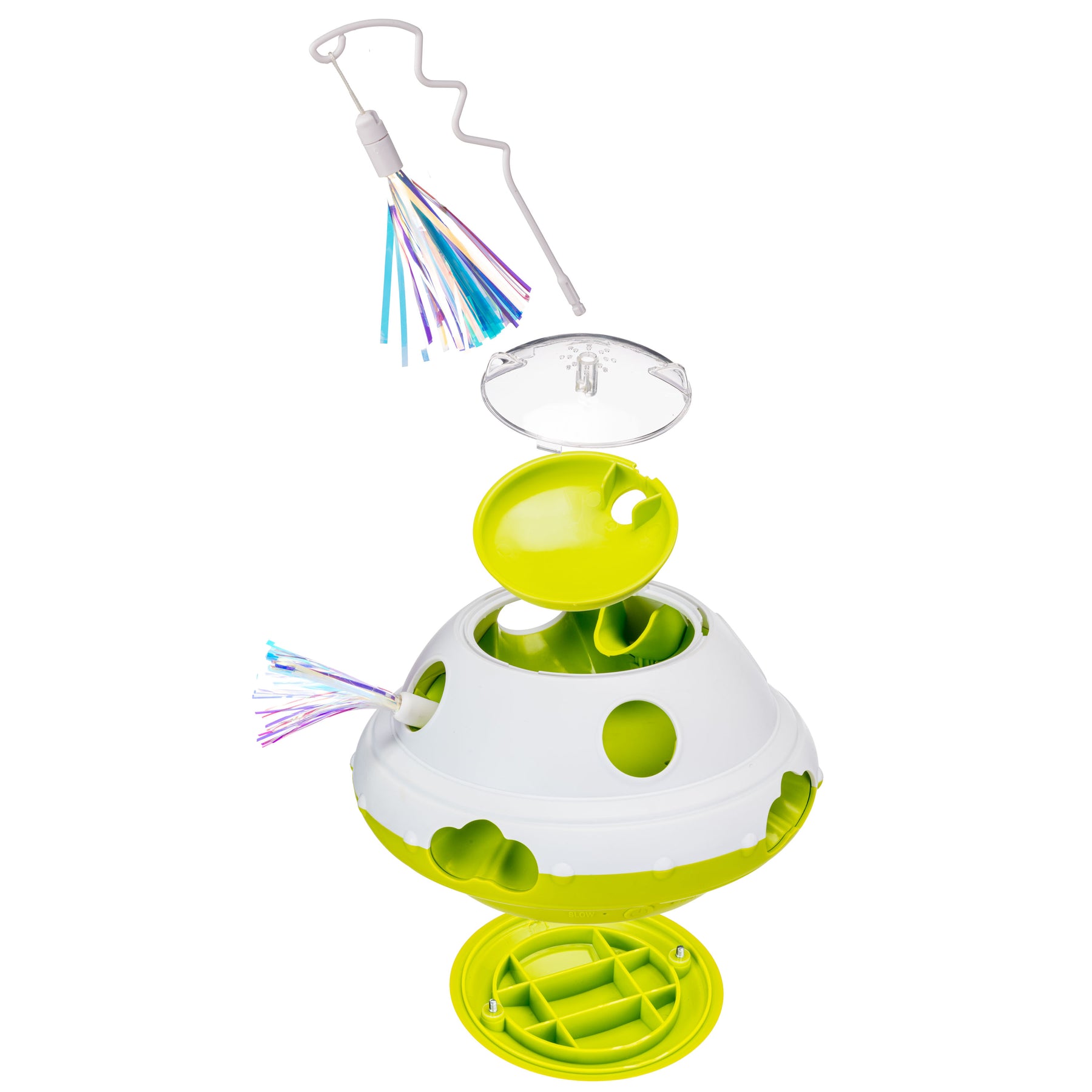 - Random feathered rod movements: the automatic arm moves to attract the cat's attention