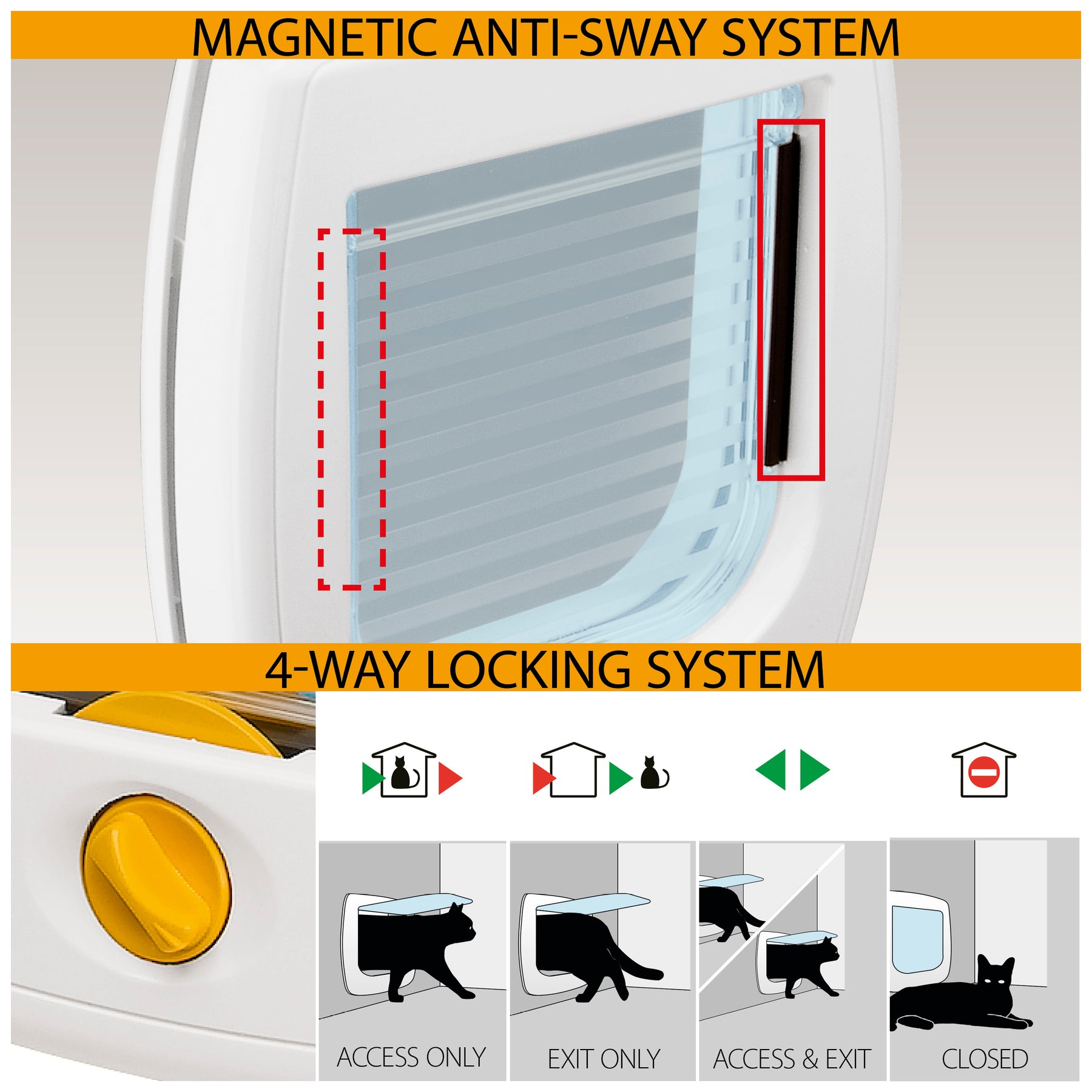 Swing flaps come with the innovative Wind Stopper System, which is a system of protection against draughts (except for the Swing 1 and 3 models). Another important feature is the 4-way locking system (not present in the Swing 1 model) that allows you to adjust the type of opening according to your needs: entry only, exit only, entry and exit, or closed. Lastly, a passage indicator (provided with Swing 5 and 7) will help you to understand whether your pet is indoors or out and consists of a flag, placed on the bottom of the pet flap, which will face the direction in which your furry friend last went. All larger flaps come with a tunnel of 5 cm, allowing them to be adapted to any structure and can be trimmed (the tunnel must not be trimmed in the models Swing 7 and Swing Microchip since they contain a very delicate mechanism).