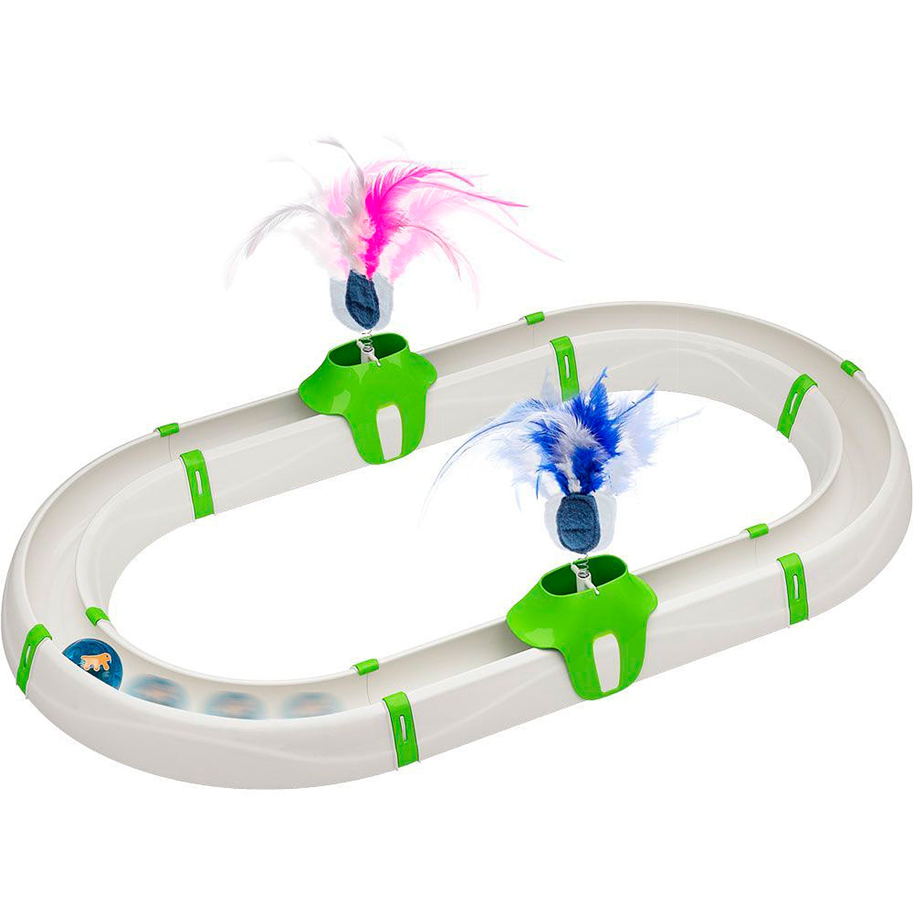 Turbine is a fun toy for cats belonging to the Clever & Happy range, specially designed to stimulate your pet's interest and make sure she always stays active and in good health. The toy, which is a shaped like a racetrack, is made of strong plastic and is easy to assemble. Included inside the box, you will find a cute glowing ball that is activated by movement and emits flashing light. Completing the toy, there are two cute spring-loaded plumes with soft feathers: Kitty will have a lot of fun seizing, making them sway and spending so many happy moments with them.