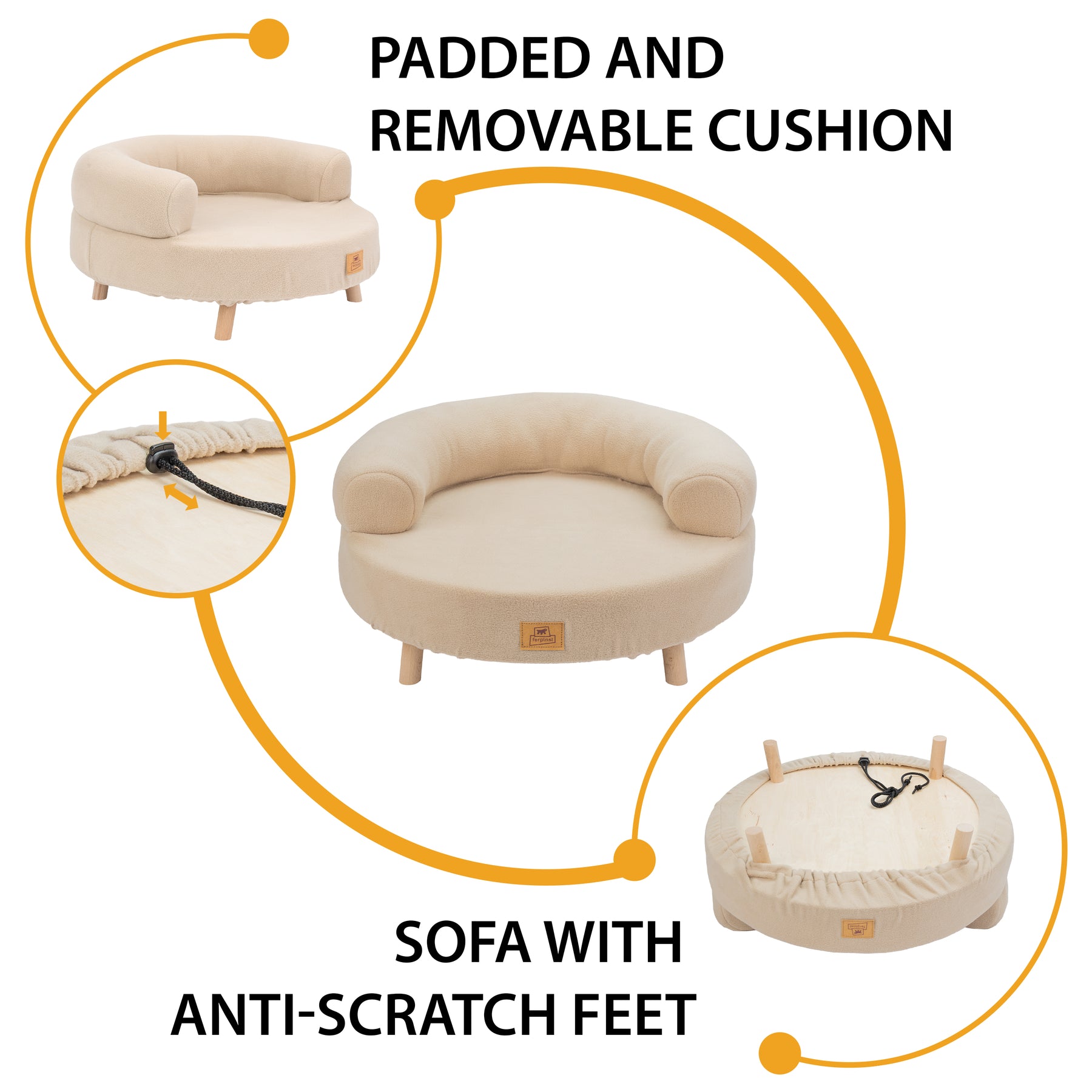 FSC™ wooden armchair-style pet bed for dogs and cats with extra-comfort cushion and washable cover.