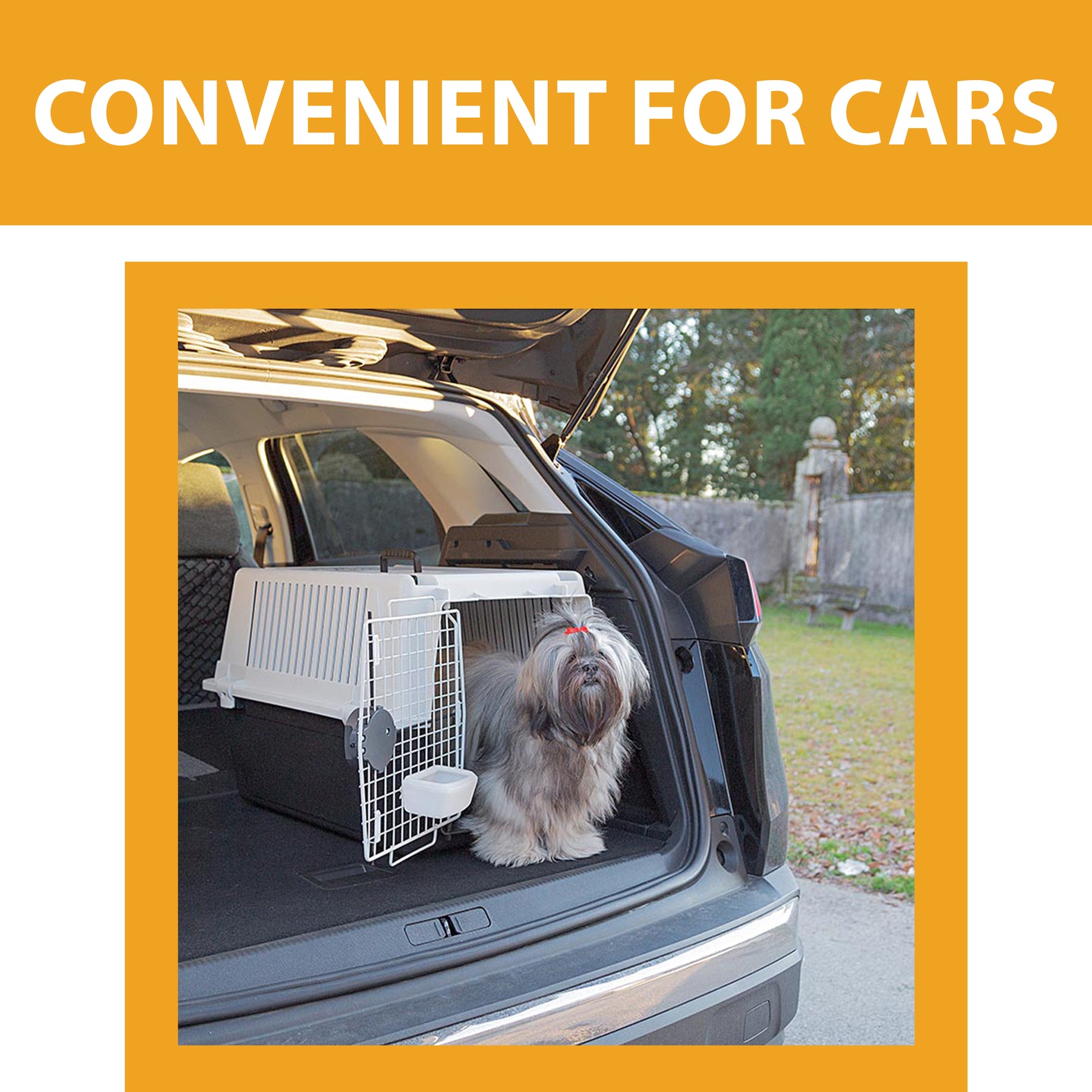 Very functional, Atlas 40 is equipped with both a fixed handle and an extractable and extendable one. Large lateral ventilation grilles allow for proper air circulation. The lateral snap clips with safety locks keep the carrier tightly closed and stable even during longer journeys. The Atlas 40 dog carrier allows your faithful friend to drink or eat whenever needed thanks to the comfortable plastic feeder included.