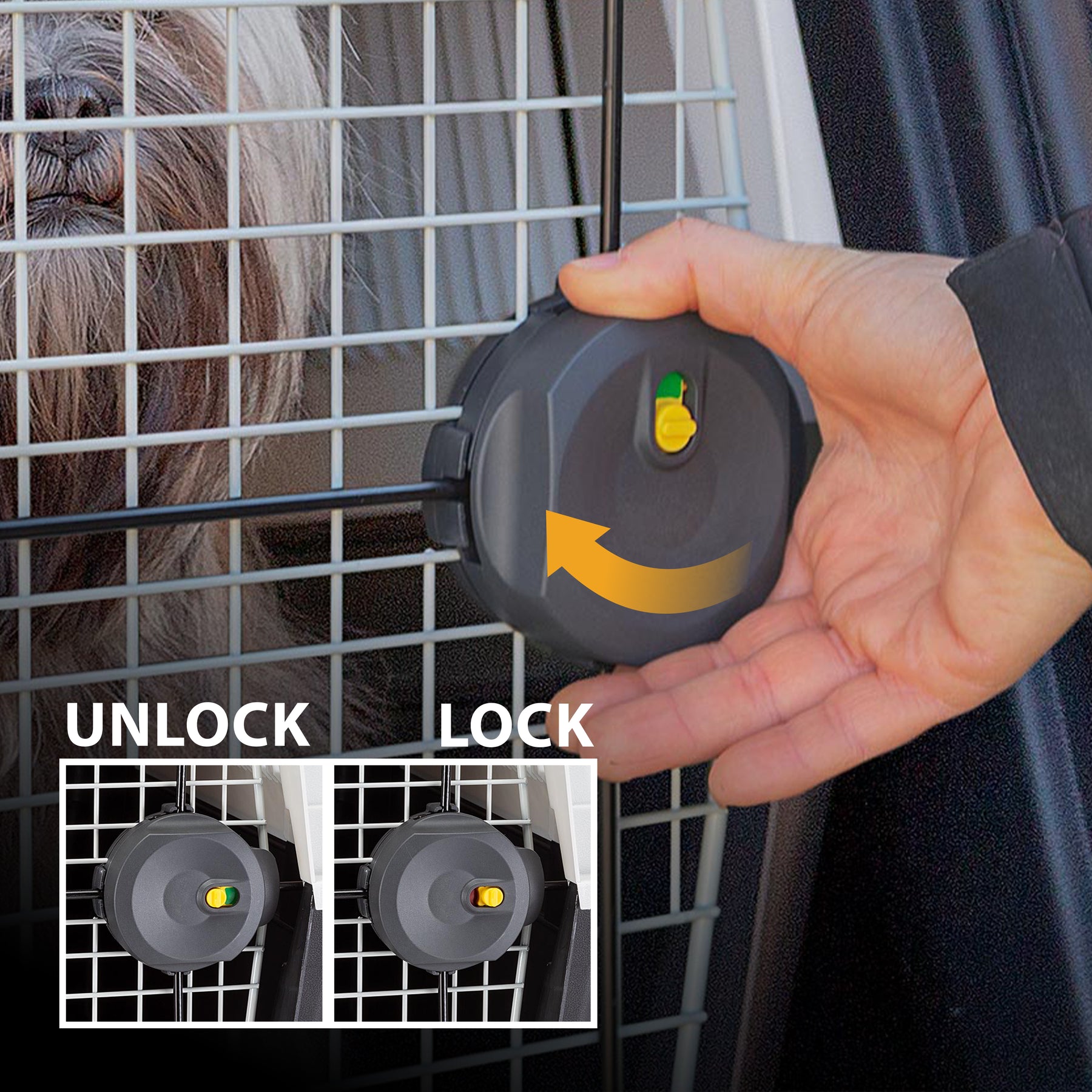The Atlas 40 dog carrier has the base and the top made of solid thermoplastic resin. The plastic-coated iron door is equipped with a recently restyled safety locking system, easy to use and extremely reliable: by turning the knob, four fixing points are activated that anchor the door to the main structure, preventing accidental openings during travel.