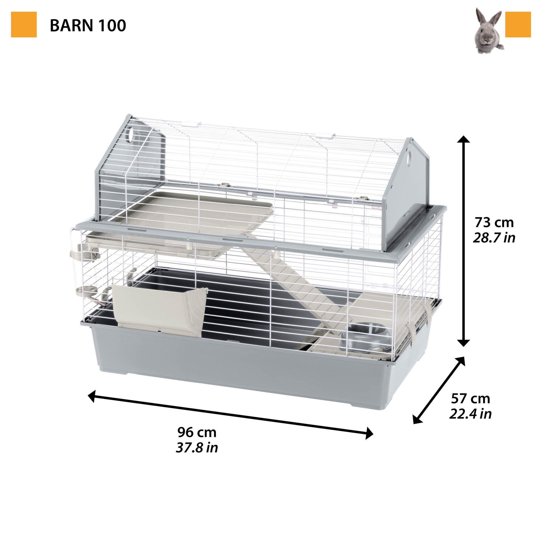 Barn 100 is reminiscent of an American barn thanks to the raised roof shape! Comfortable and spacious, this rabbit cage has plenty of room: on the lower floor, you will find a small rabbit house, perfect for moments of relaxation, while a plastic ladder leads upstairs where you will find the living area for your pet. The habitat is equipped with indispensable accessories such as feeder, bowl and drinker.