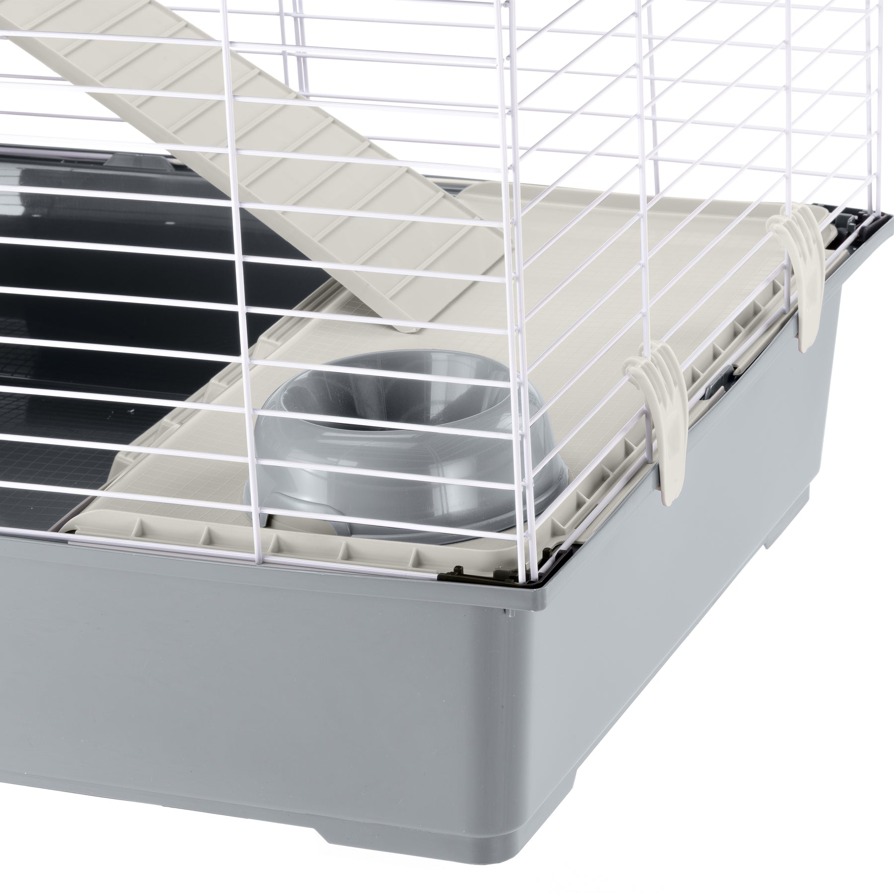 The cage, which can be completely disassembled, keeps the volume reduced, and is made of sturdy painted metal mesh with a thermoplastic resin base to effectively contain dirt, litter and food residues. On the front, a comfortable ladder allows the small animal to go out and enter independently.