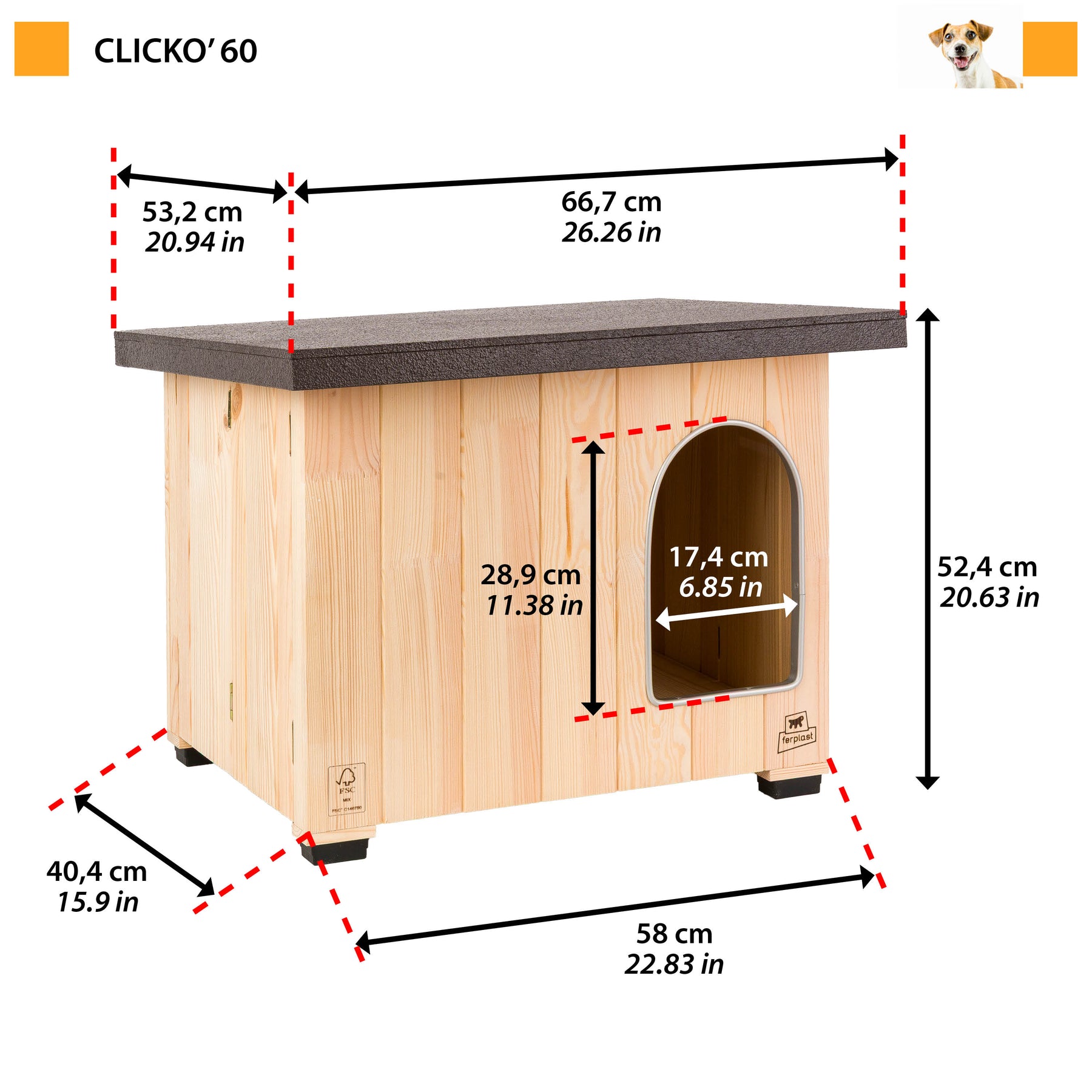 Clickò is an outdoor wooden dog kennel designed to offer immediate assembly, comfort and long-lasting protection in any season. Its innovative self-assembling structure opens with a single gesture and requires no tools, making it ideal for anyone looking for a sturdy wooden dog house ready to use straight away. Made from high-quality Nordic pine, it ensures excellent durability, stability and insulation.