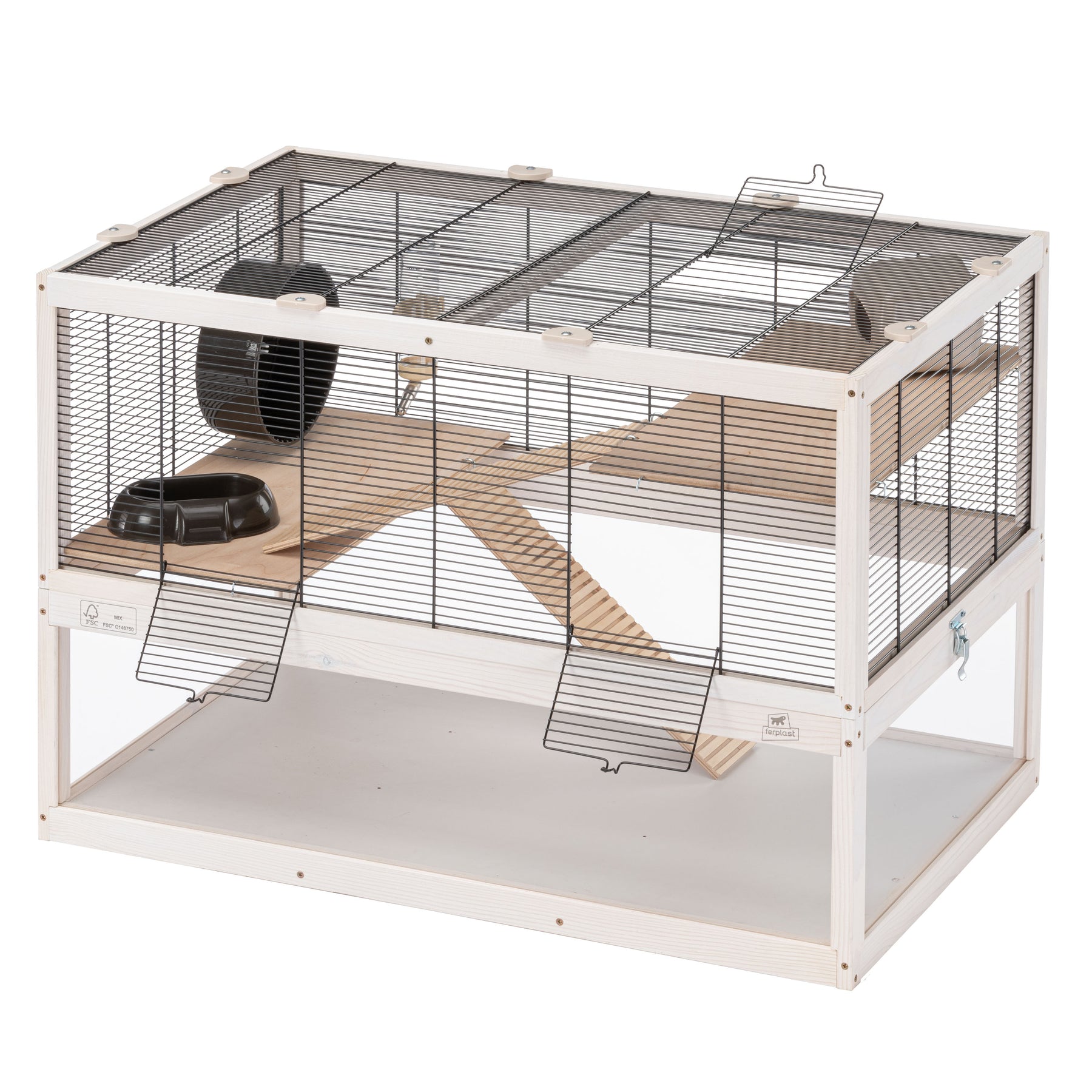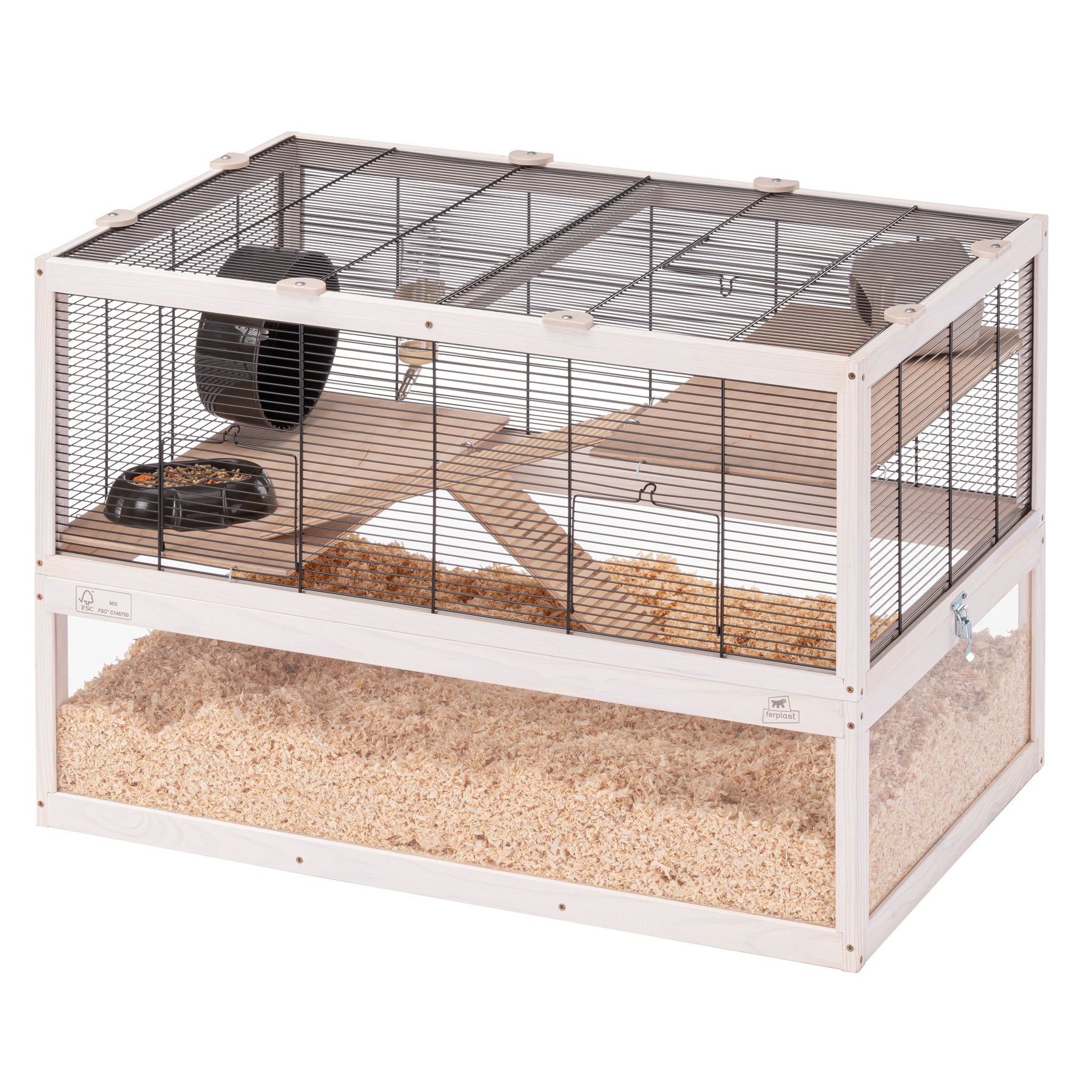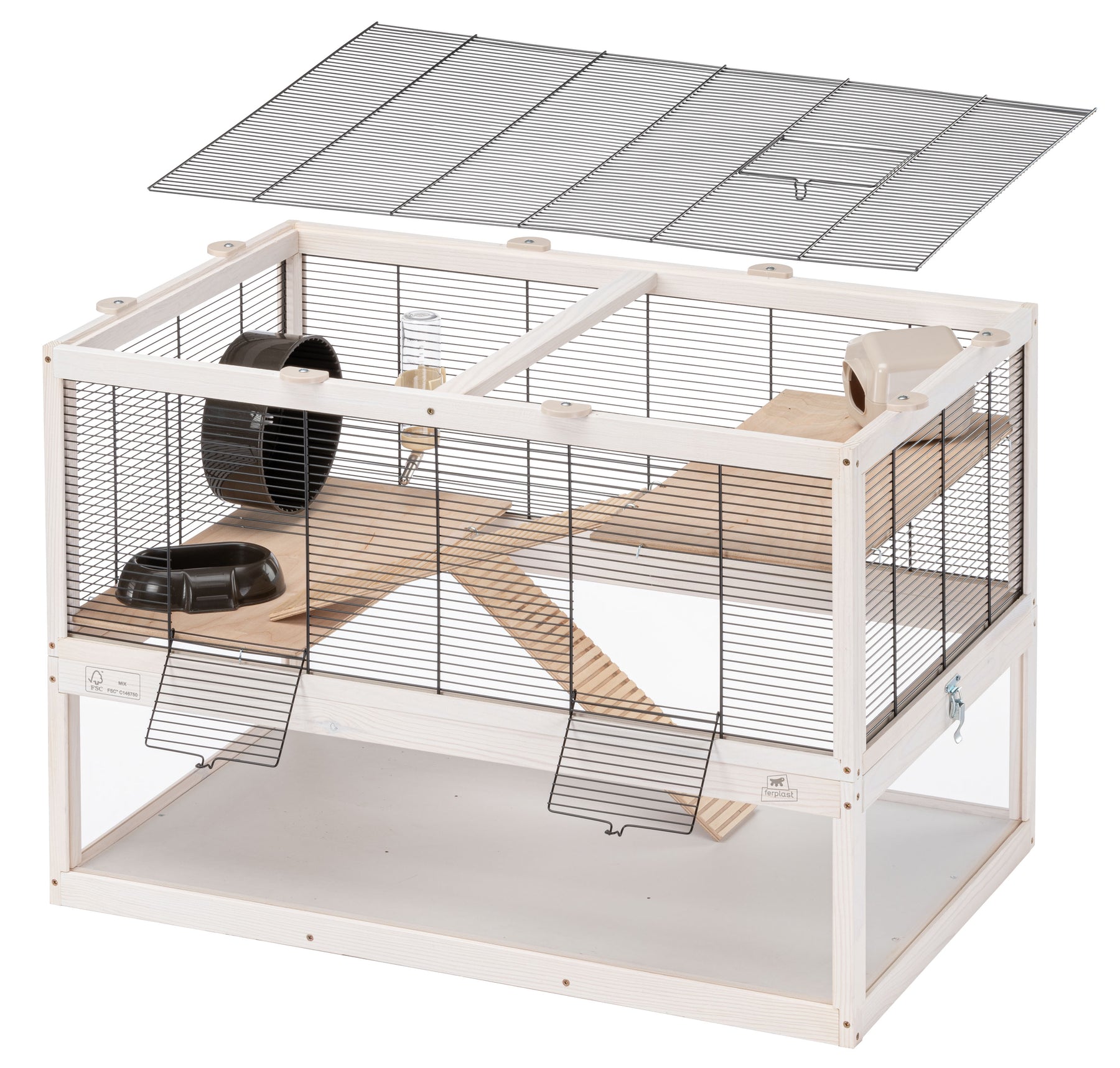 Included in each habitat you will find indispensable accessories such as a resting house, a wheel for keeping fit, a plastic feeder and a drinking bottle with stainless steel spout.
