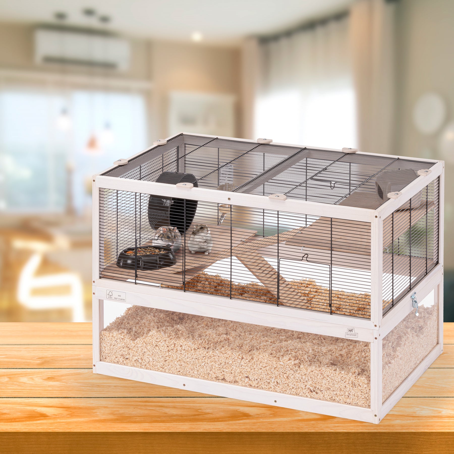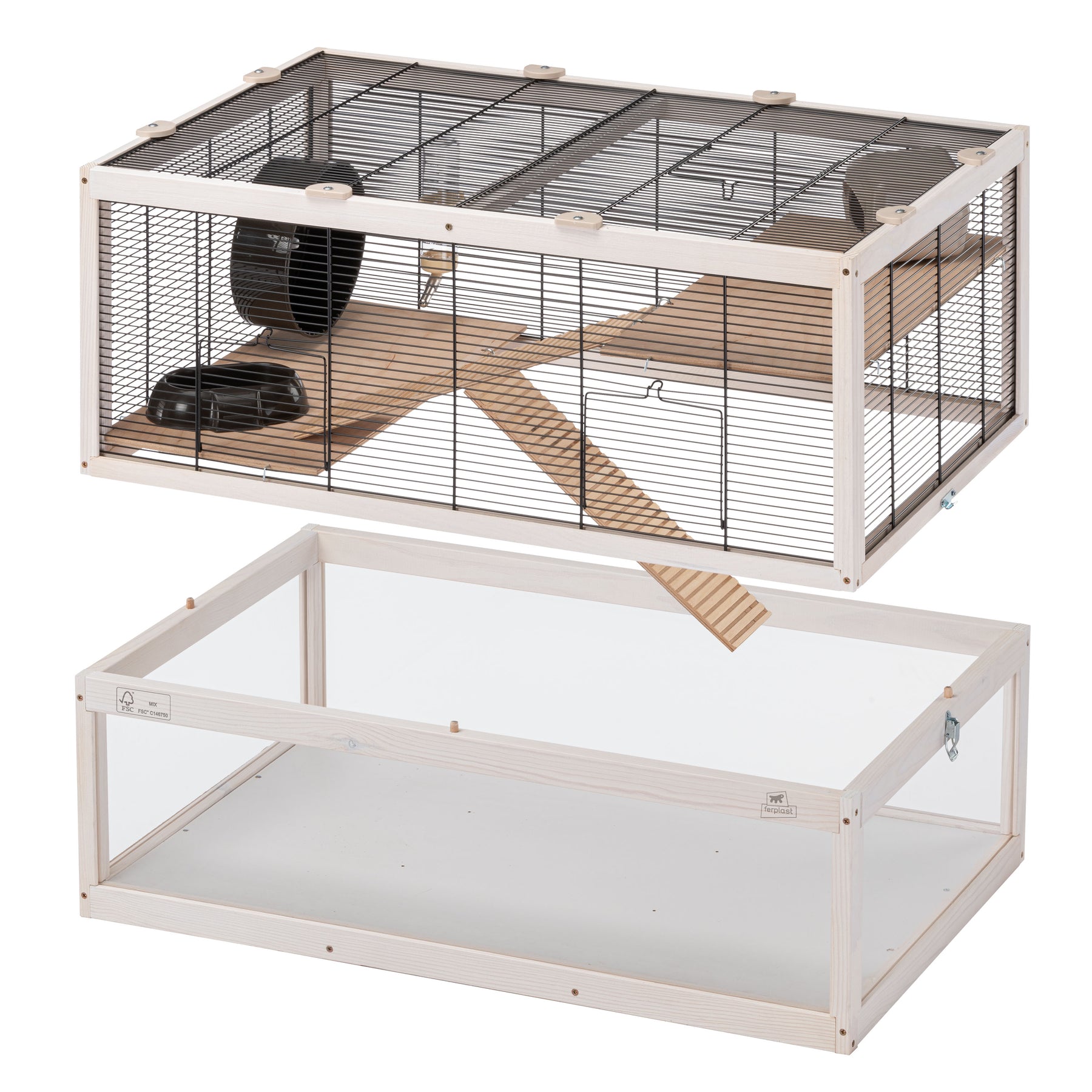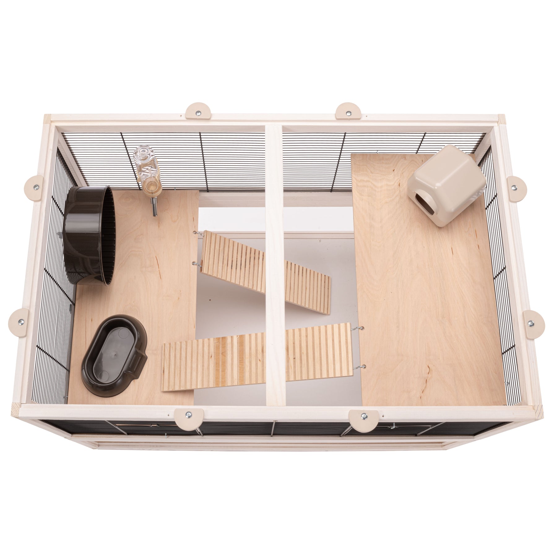 Included in each habitat you will find indispensable accessories such as a resting house, a wheel for keeping fit, a plastic feeder and a drinking bottle with stainless steel spout.