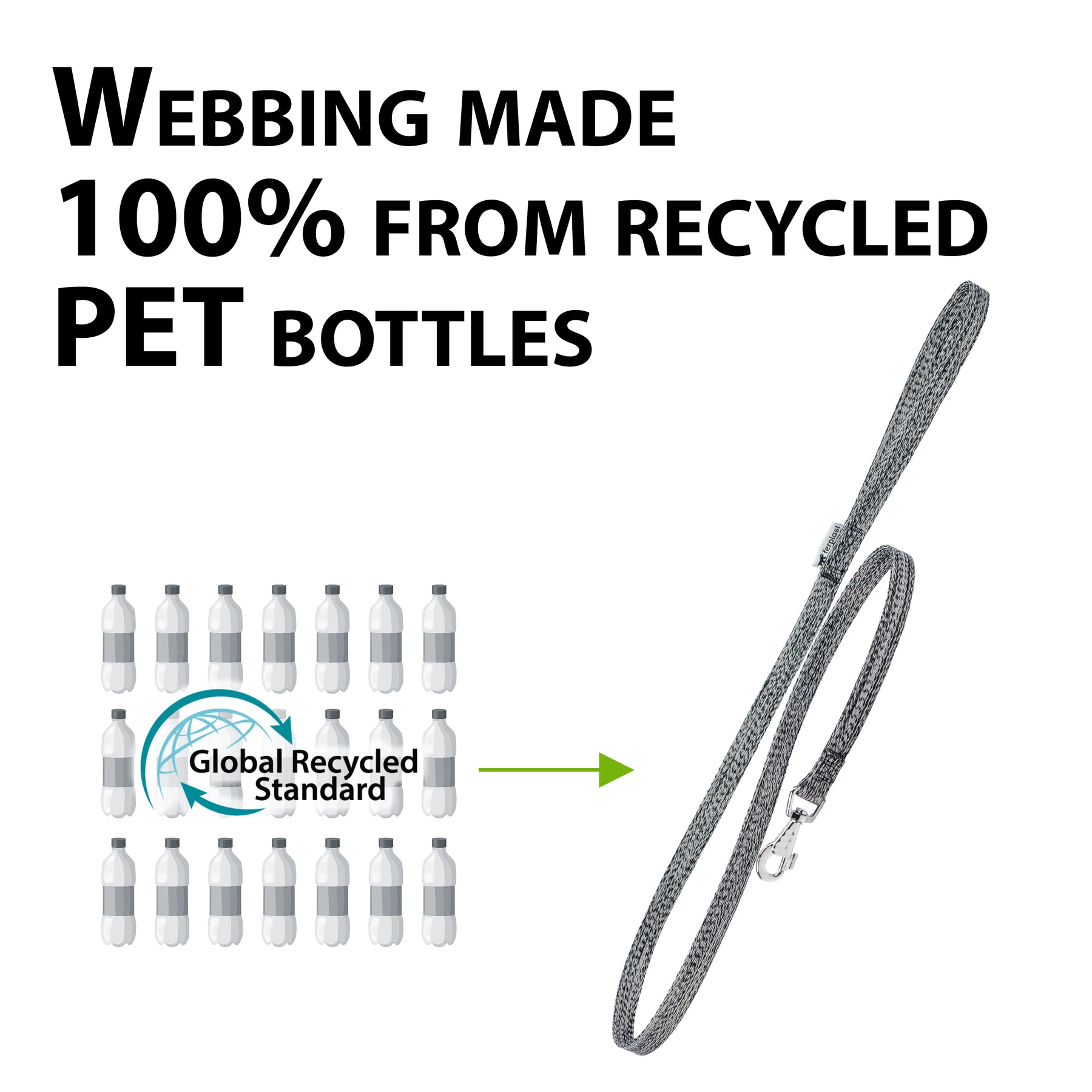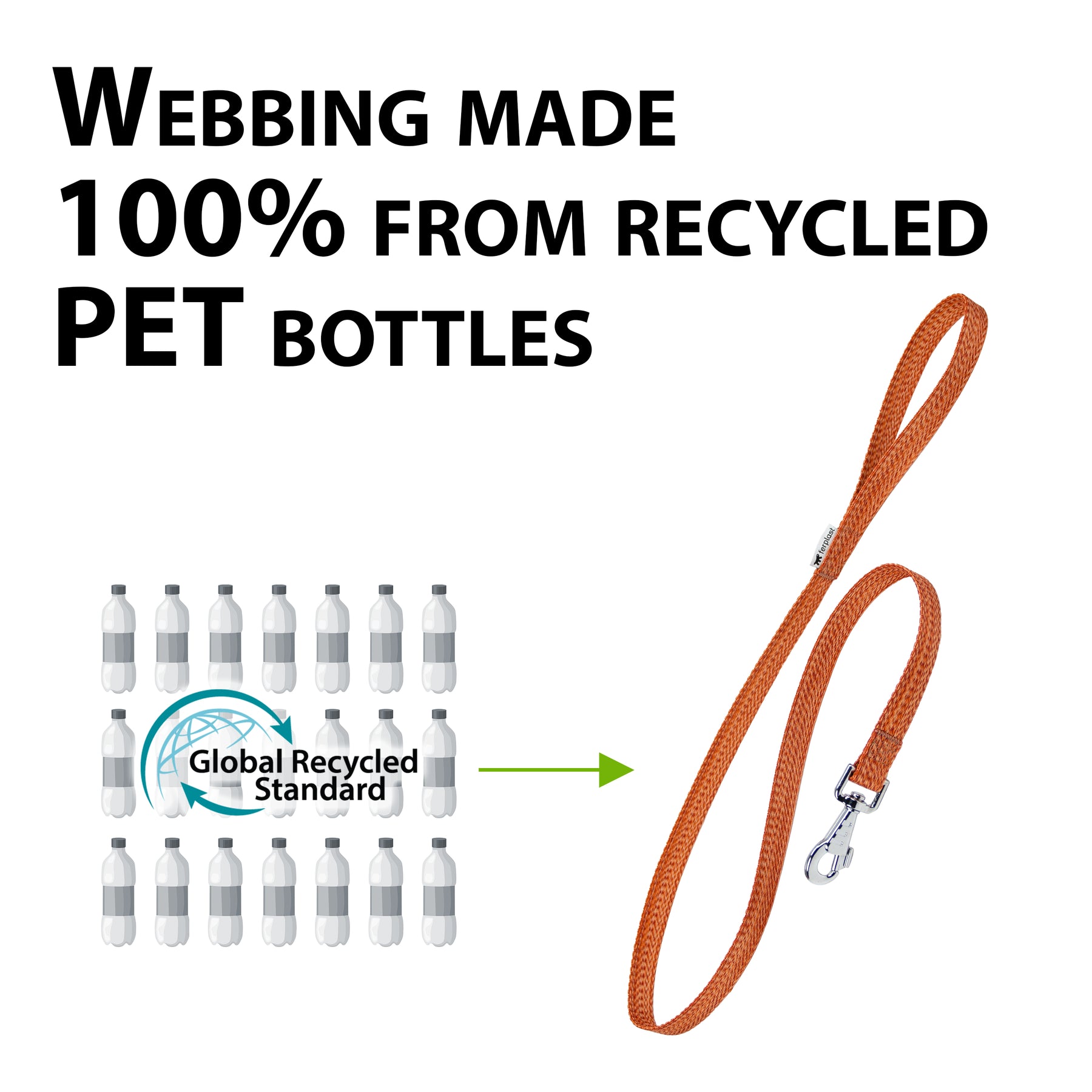 The leashes feature tape made from 100% recycled polyester from PET bottles and are certified by the Global Recycled Standard, a guarantee of safe, eco-friendly, high-quality materials. Each leash not only reduces plastic waste, but turns it into a strong and durable dog accessory, perfect for everyday use.