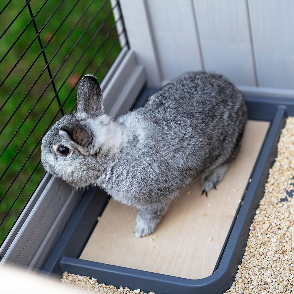 The roof is flippable for easy maintenance and to pick up your rabbit when necessary. For easy cleaning, the two roomy poo trays can be removed and are kept hidden from view thanks to a flippable wooden door that can be locked in place using its own hooks. The opening that gives access to the lower floor is equipped with a closing lid, very practical during cleaning, and with a higher edge to keep the litter from spilling.