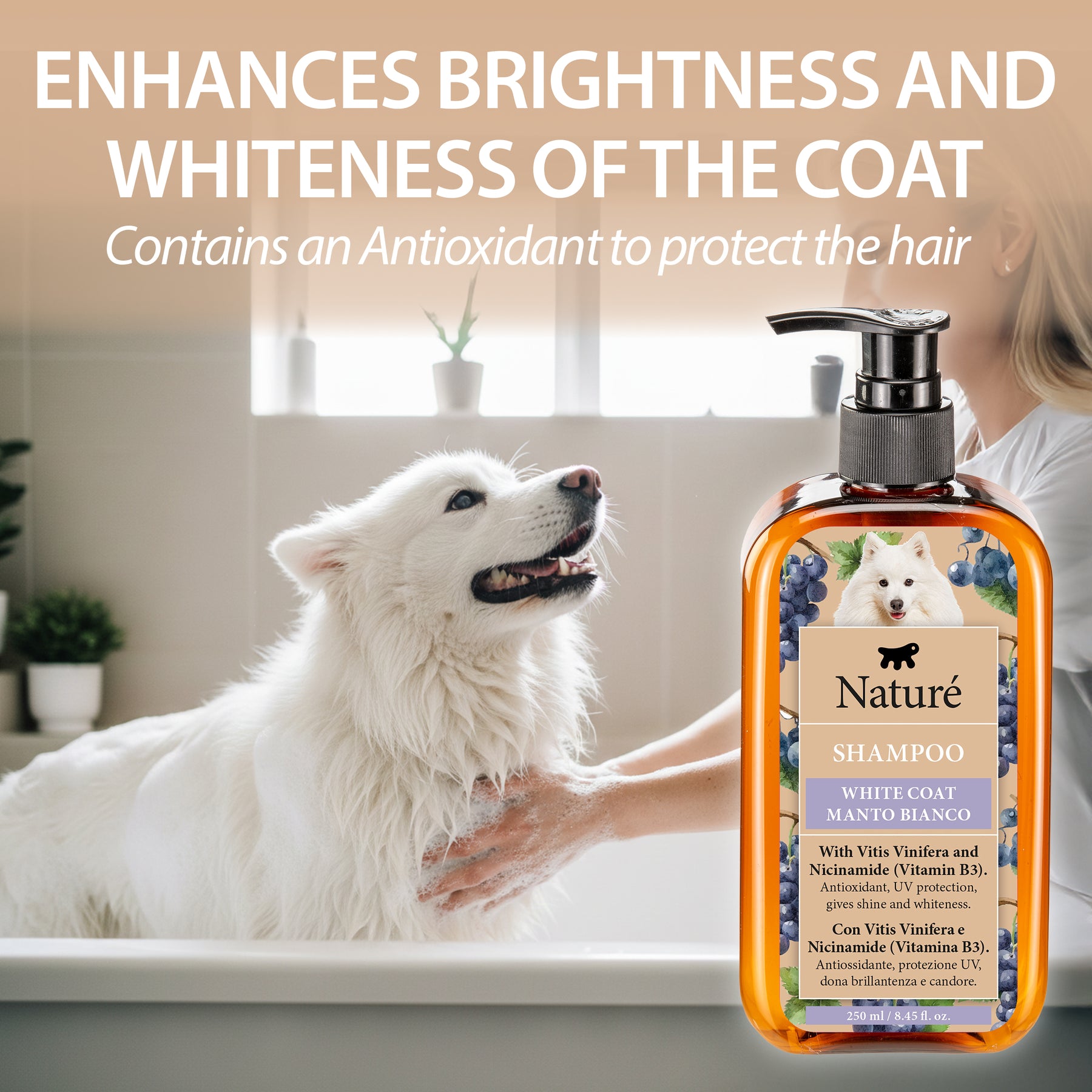 - Natural shampoo for dogs with white or light coats, with antioxidant and protective action