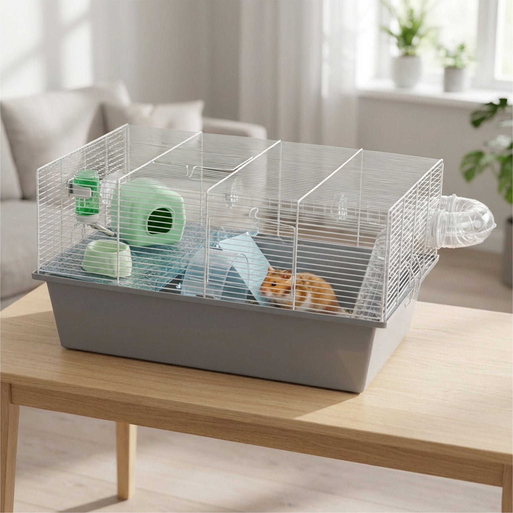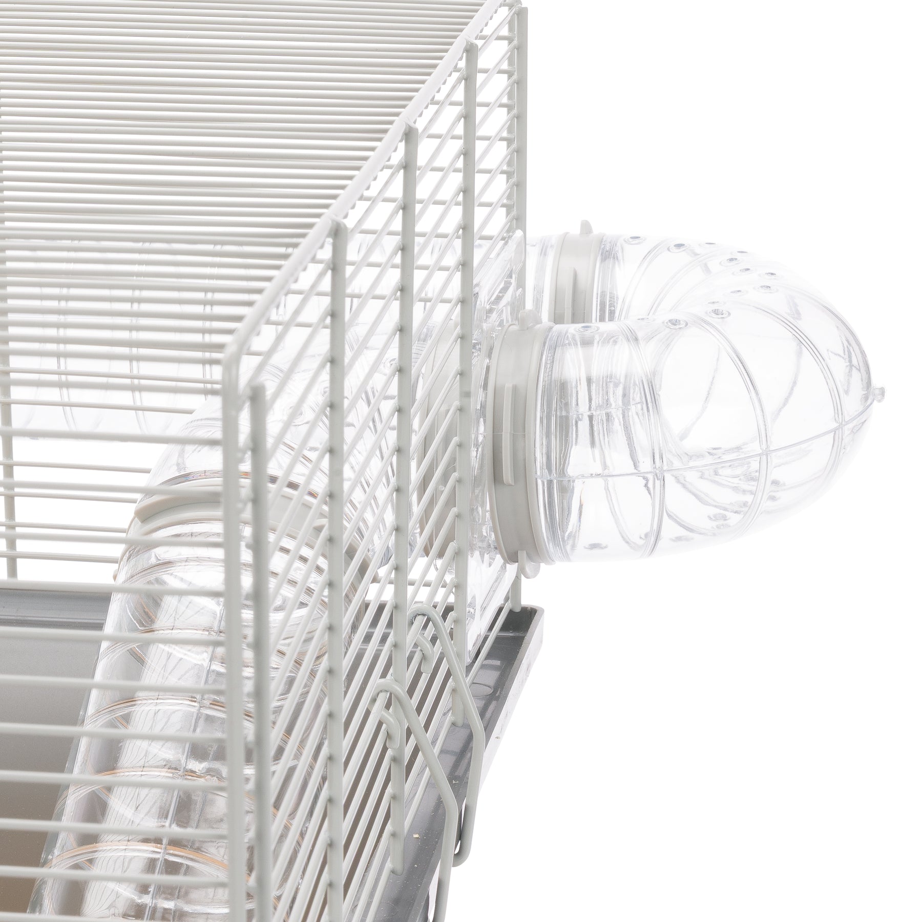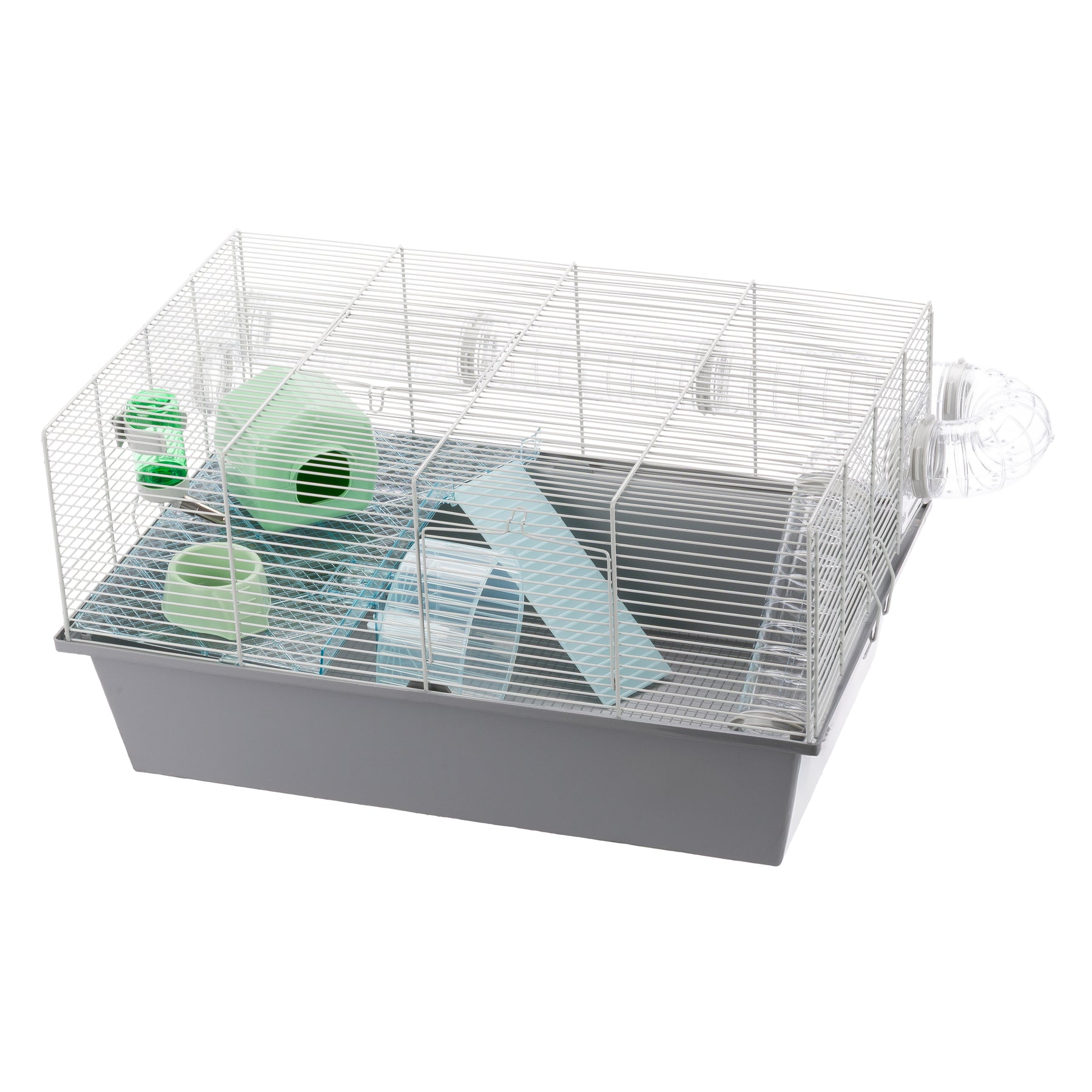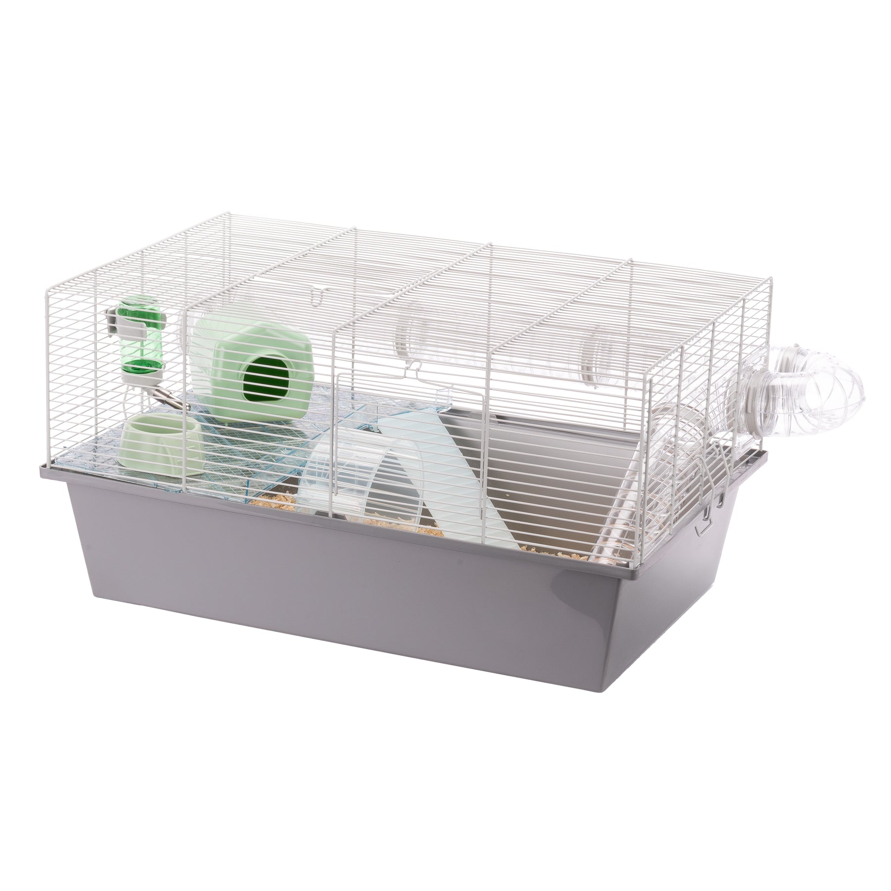 Milos Large is the cage for mice, also suitable for hamsters, made from solid metal wire net with plastic base. Thanks to its particular tight-knit wire mesh, it allows to home small rodents in total safety. The habitat Milos Large is complete with useful accessories like shelf, ladder, nest and wheel, as well as transparent tubes designed for your animal's great enjoyment. Practical and easy to clean, it is equipped with a high base preventing litter to be spilled outside the cage out for an always tidy and clean environment.