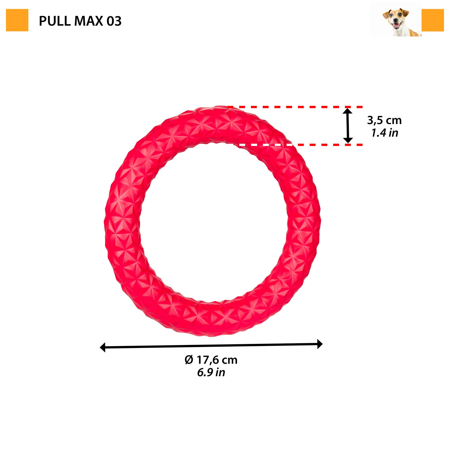 The EVA material, known for its strength and flexibility, makes this toy perfect for outdoor activities. Thanks to its buoyancy, Pull Max is also particularly suitable for water play, adding an extra dimension of fun to play sessions. The odourless material it is made of guarantees a pleasant experience for you and your dog. This dog play ring is also an effective tool that aids in cleaning teeth through the mechanical action of chewing. It has an irregular surface that exercises the mouth muscles and provides a pleasant massage to the dog's gums, helping to keep them strong and healthy.