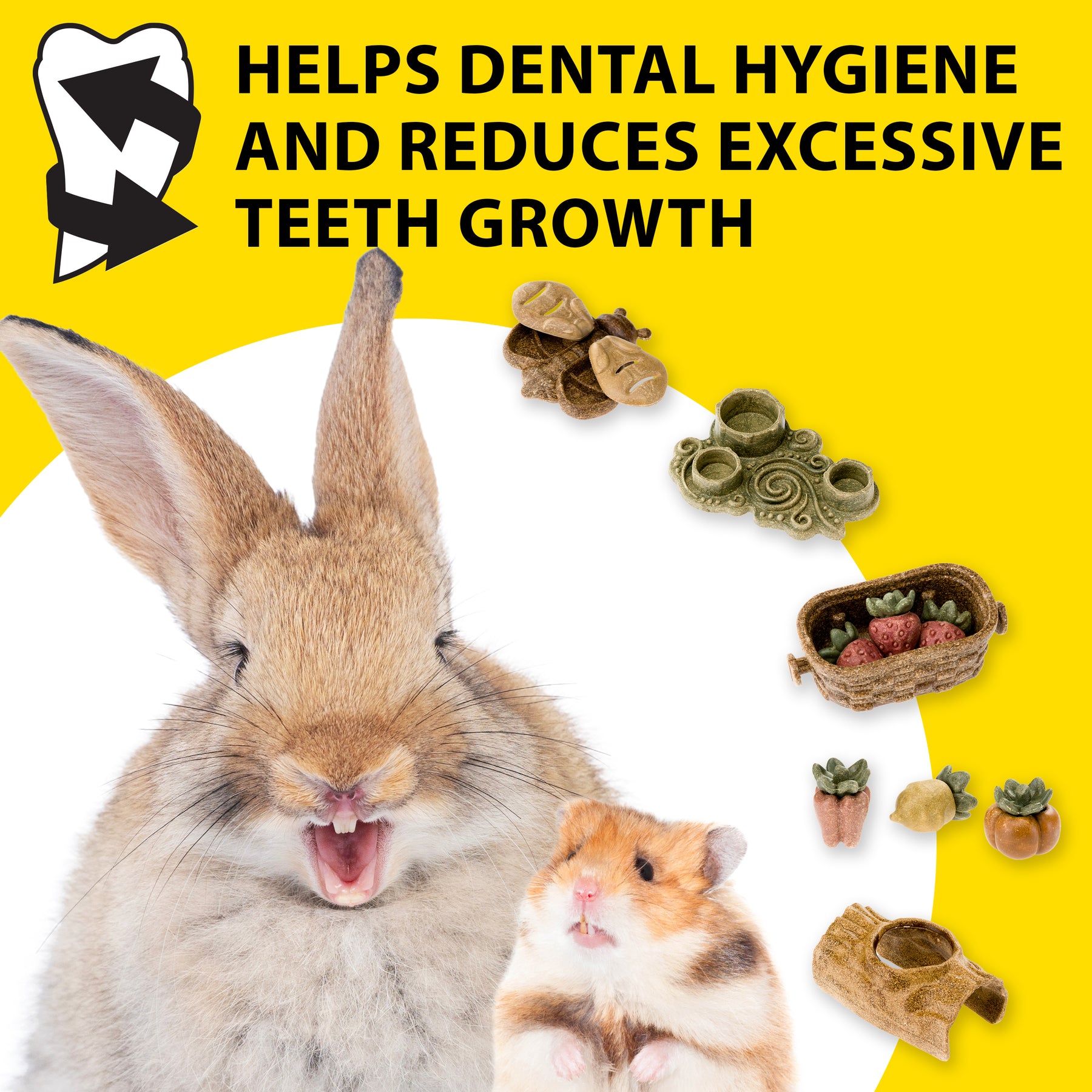 La textura dura y crujiente convierte Veggie Bites Flores en un eficaz snack masticable para roedores, estimulando la masticación prolongada. Esta acción favorece el desgaste natural de los dientes, que crecen continuamente en conejos y roedores, por lo que el producto puede utilizarse también como snack dental para conejos, cobayas y hámsters.