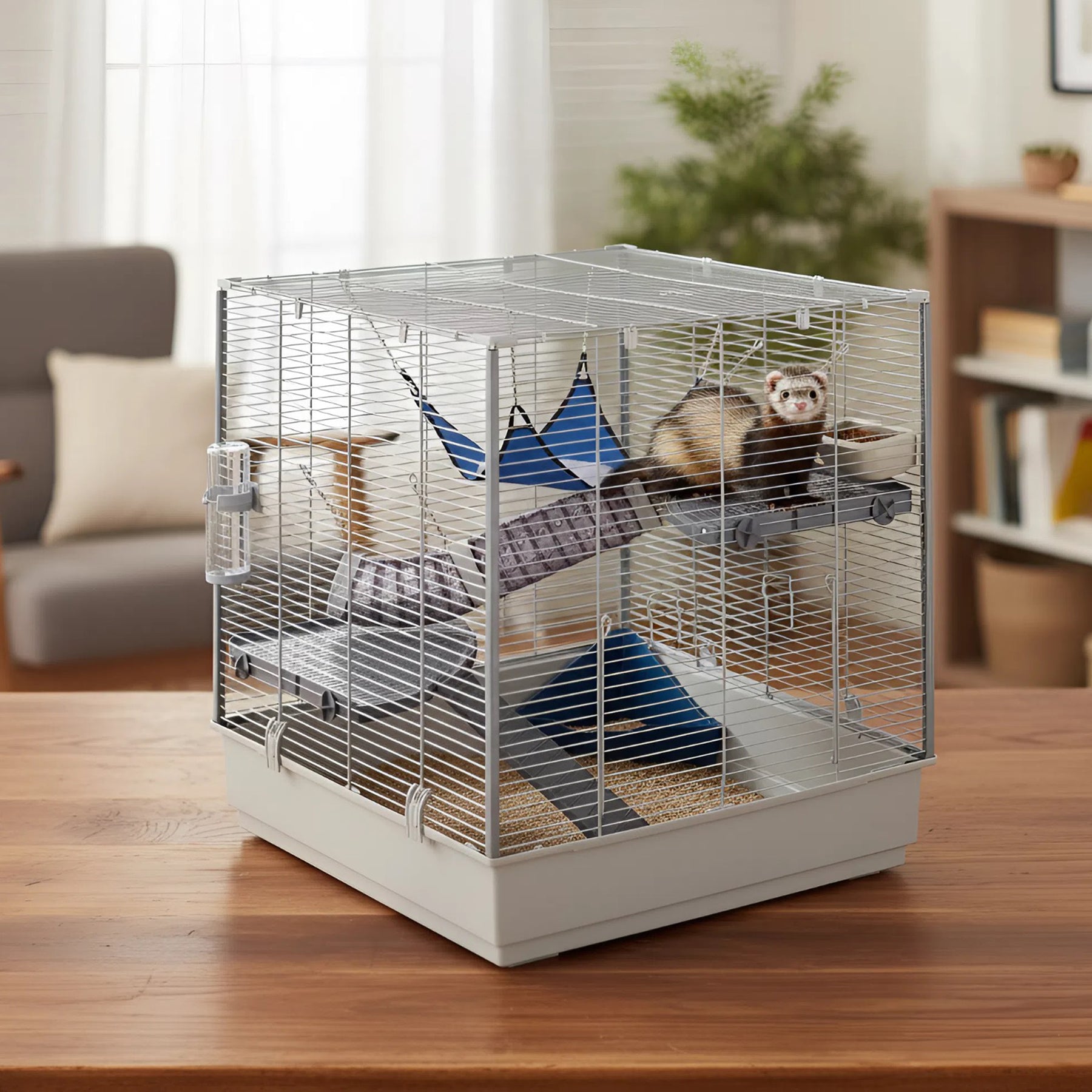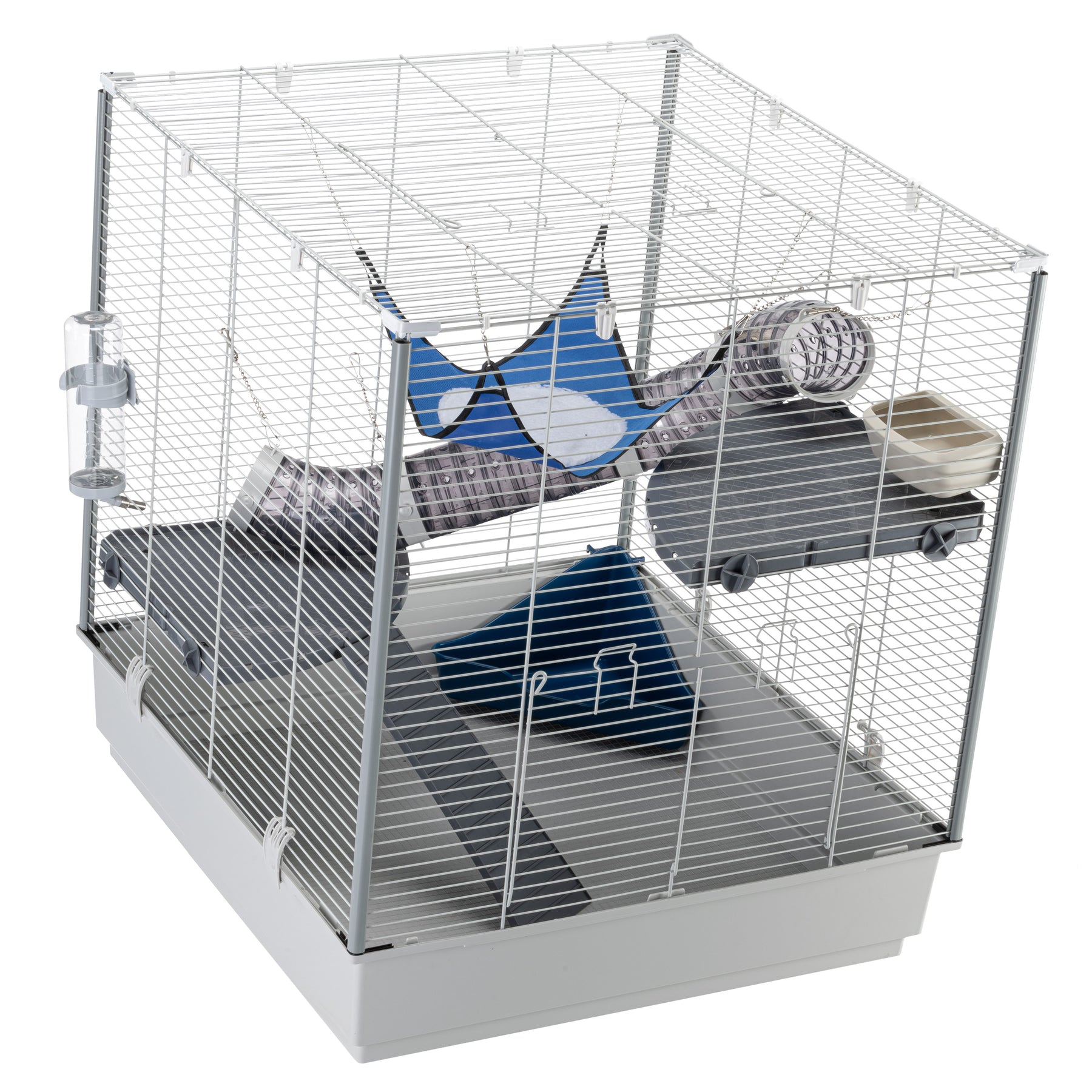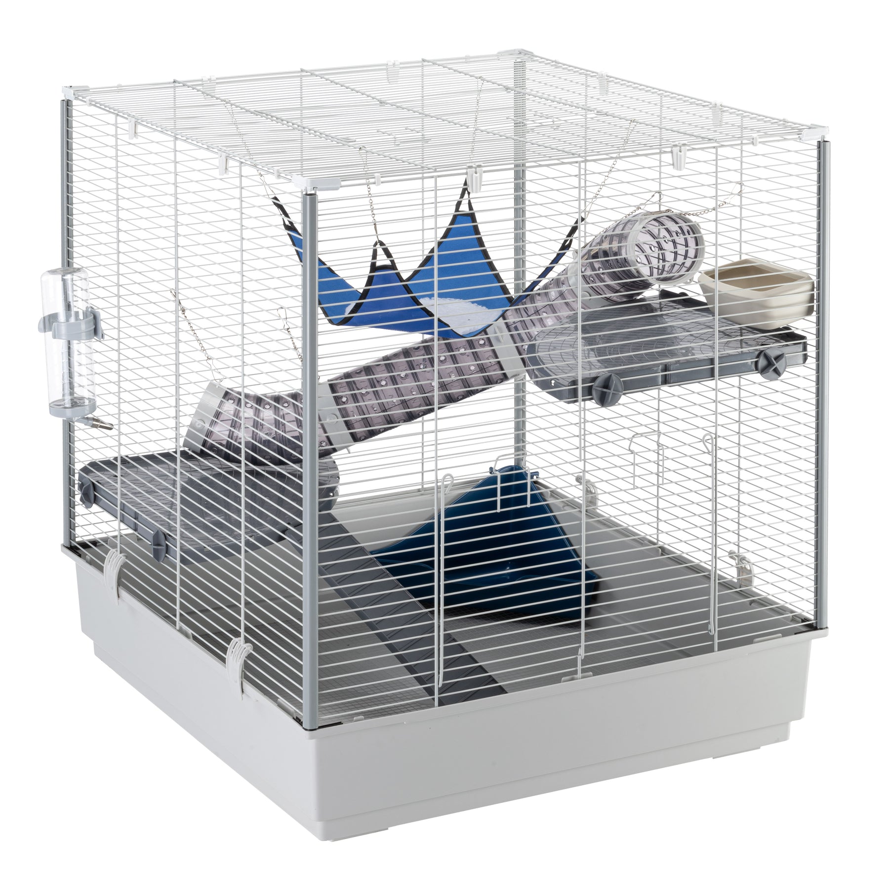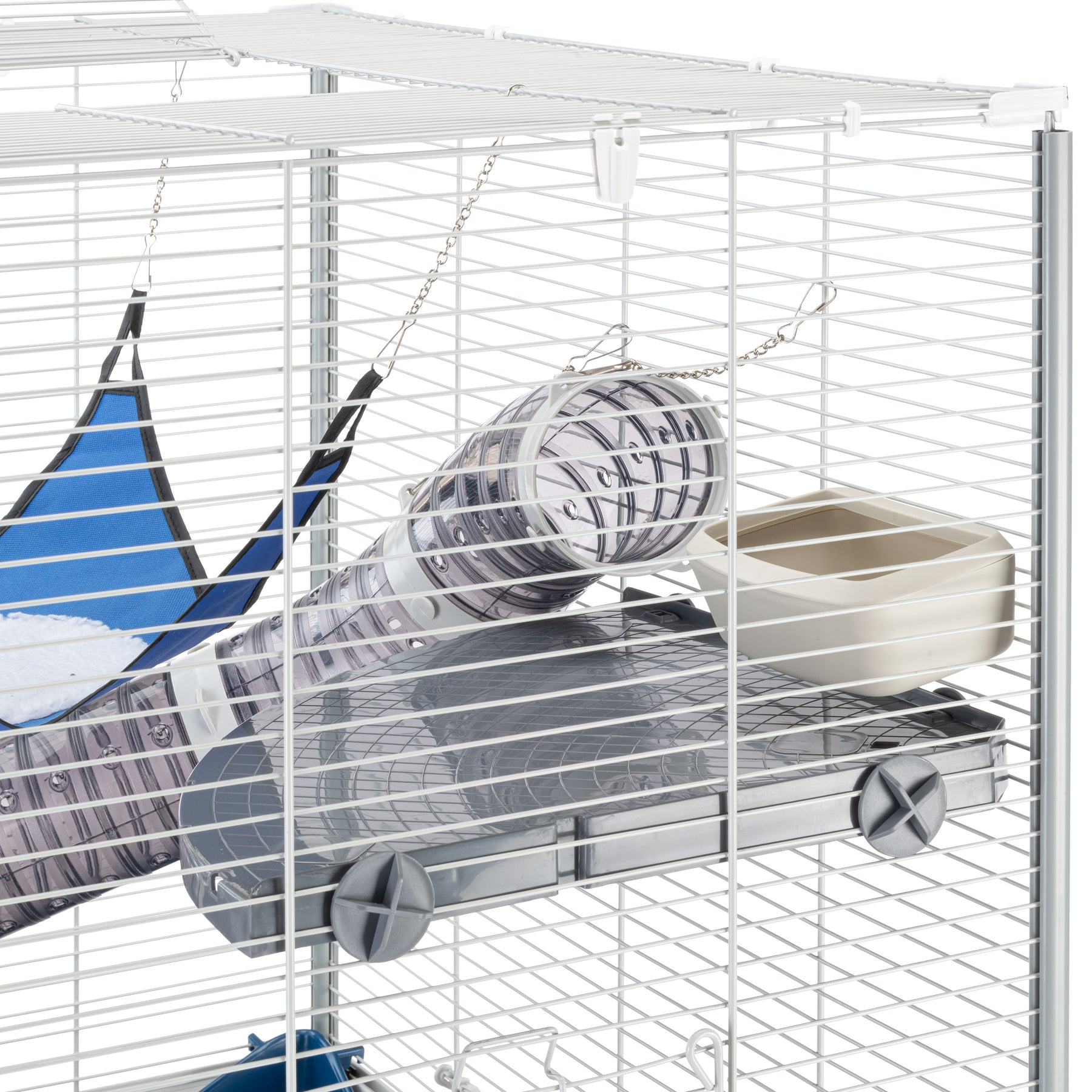 Accesorios incluidos: aseo esquinero para hurones, comedero de plástico, bebedero y una agradable hamaca con cadena metálica para su sujeción. Para que su amiguito pueda jugar, también encontrará dentro del hábitat tubos de plástico que se pueden colgar y utilizar para conectar los distintos niveles.