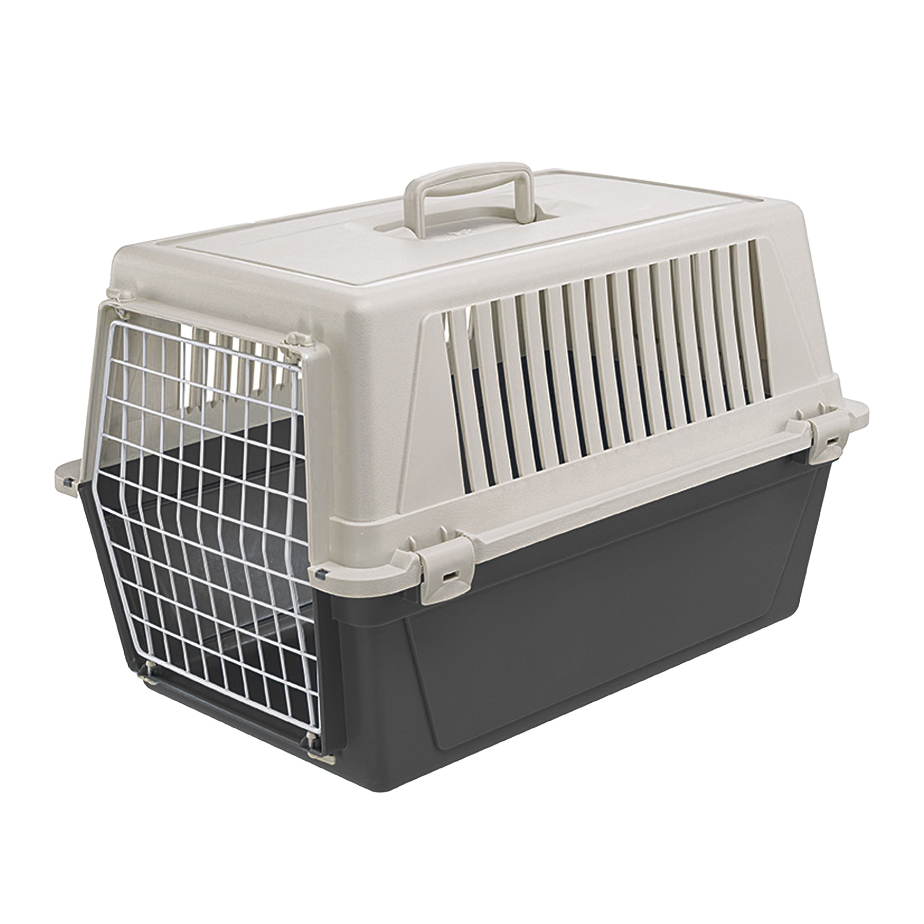 Atlas EL is the most basic version of our pet carriers for cats and small dogs and has multiple functions. Atlas EL is easy to carry with you, thanks to its fixed handle, and is ideal for travelling with your pets on the most common means of transport (car, train, ship, aircraft). This plastic pet carrier for cats and small dogs comes complete with a solid door made of plastic-coated iron. It is very sturdy, thanks to its fastening system with lateral spring clips. It also has lateral ventilation grilles, which ensure sufficient ventilation inside the carrier.