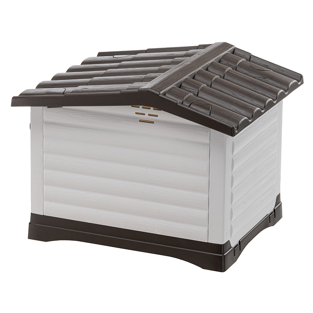 Made of tough thermoplastic resin, shock and UV resistant material, Dogvilla is an outdoor dog kennel equipped with an opening system from the side wall (patented). The opening panel can be mounted on the right or on the left. Once opened, it becomes a convenient platform, resting on the ground, giving your dog much more space. Ideal for all seasons, closed in winter or open in summer, the kennel Dogvilla is complete with a ventilation system which ensures excellent internal ventilation avoiding the formation of humidity thus guaranteing a dry environment at all times; the base is designed with special slots that allow the water to run away from the kennel.