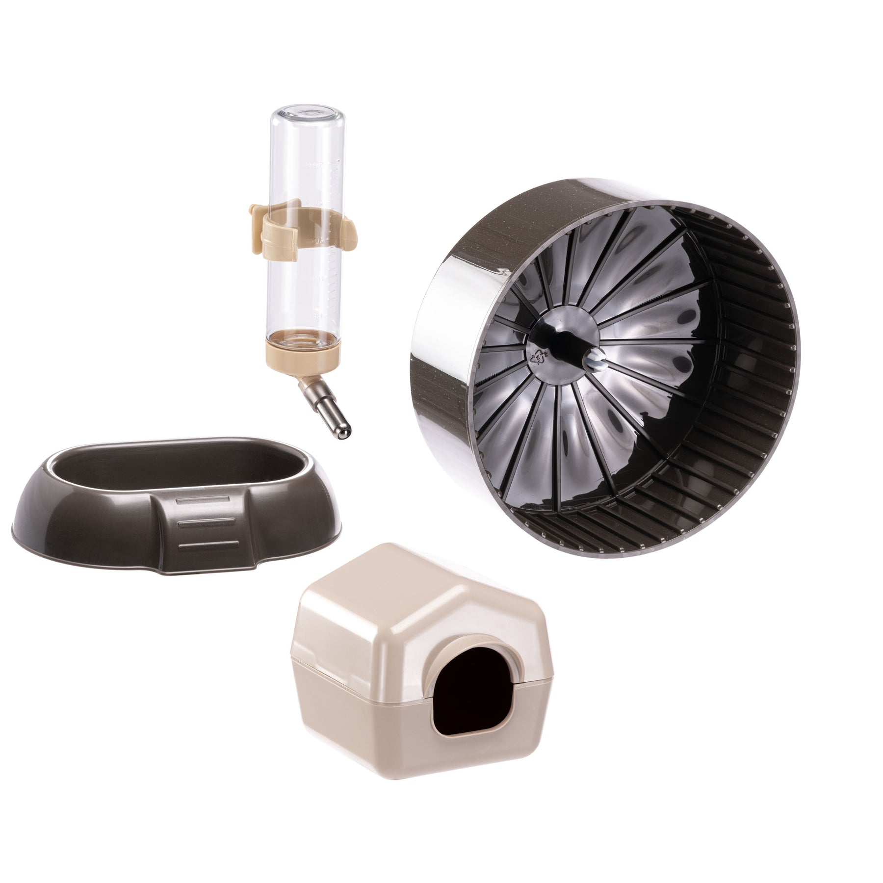 Included in each habitat you will find indispensable accessories such as a resting house, a wheel for keeping fit, a plastic feeder and a drinking bottle with stainless steel spout.