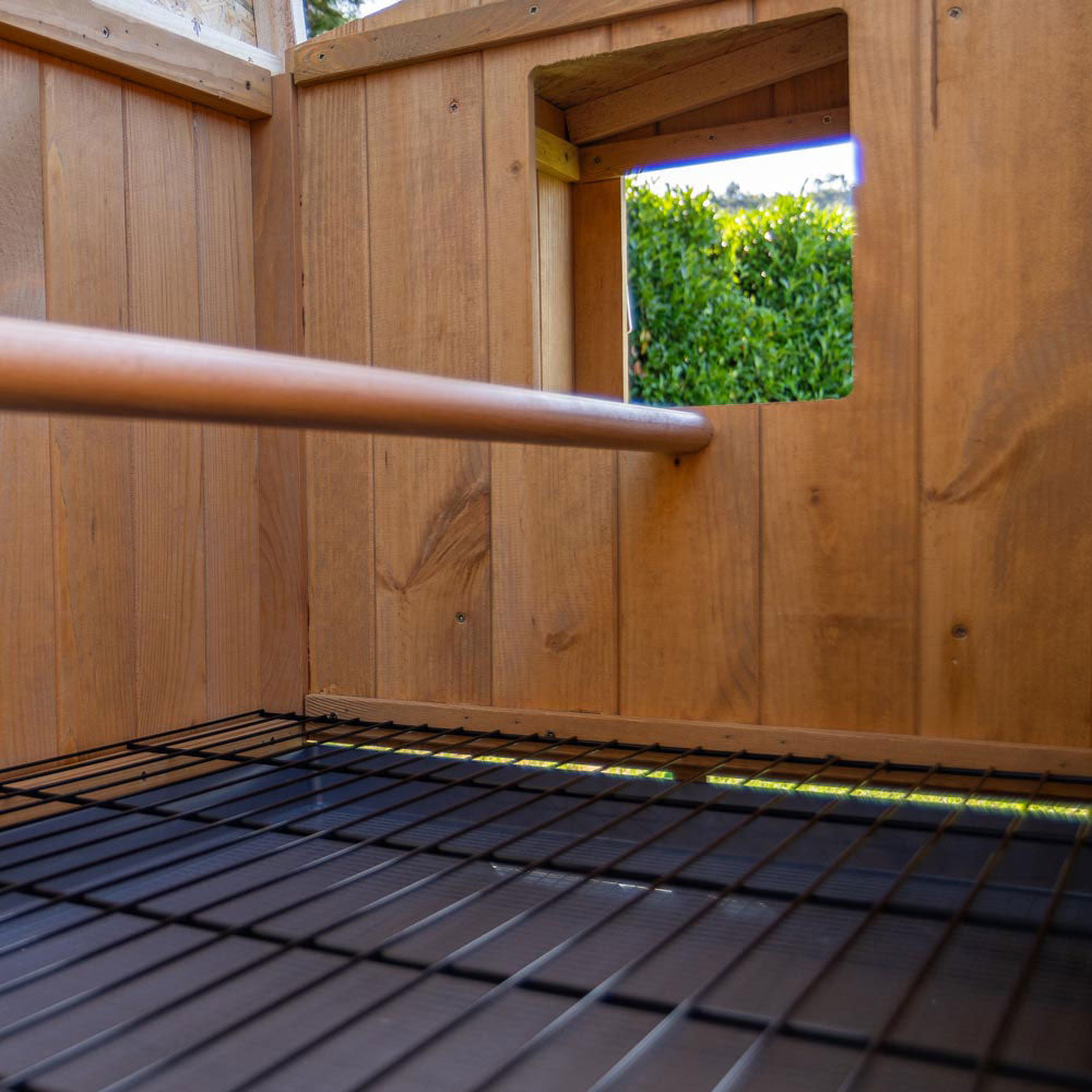 - Inside equipped with wooden perch, protective grill and removable tray for collection of dirt