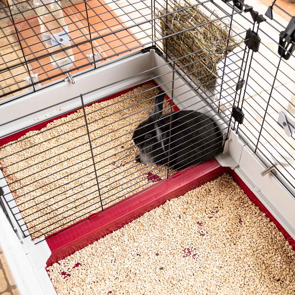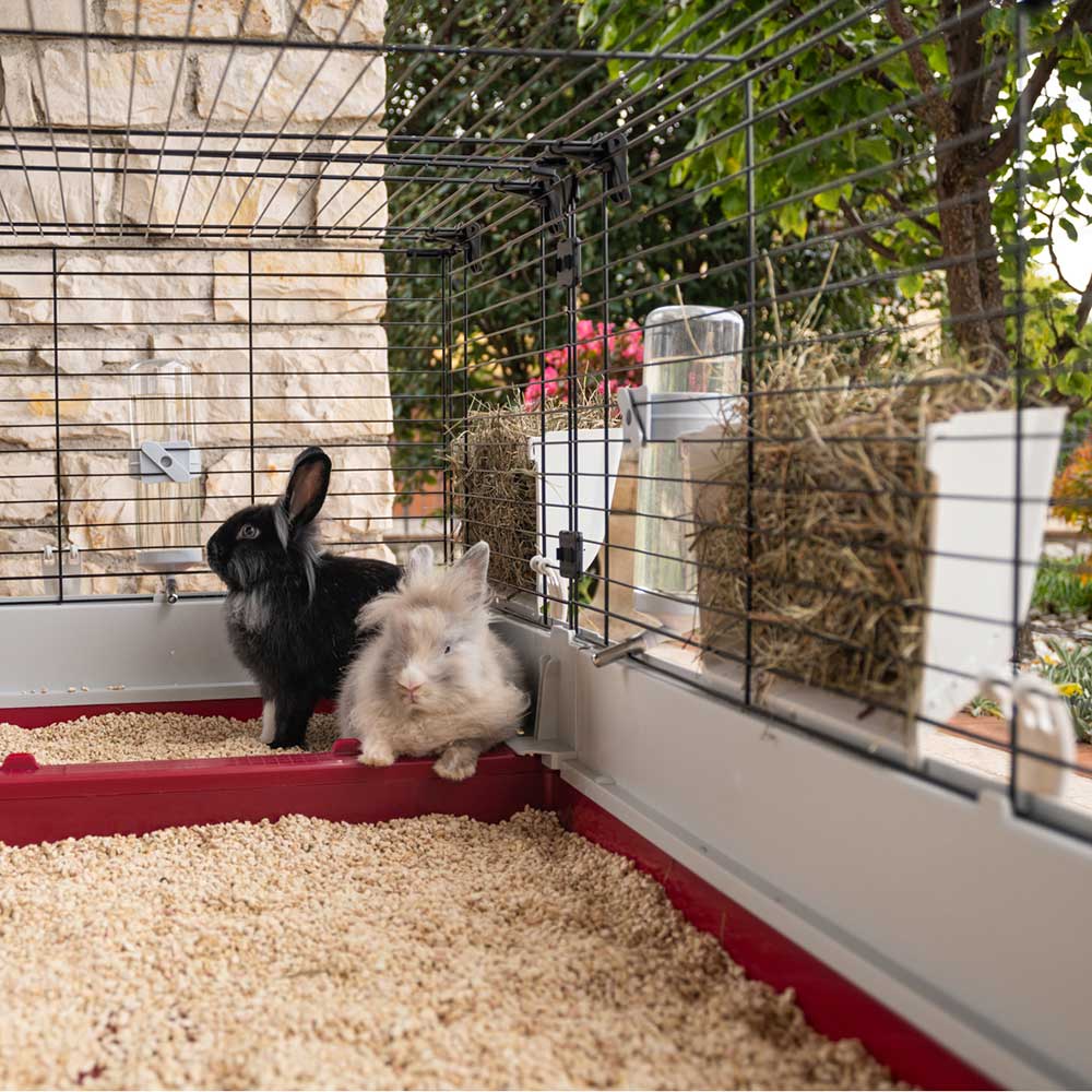 - Included accessories: bowl, drinking bottle, hay feeder, plastic house, partition with steps