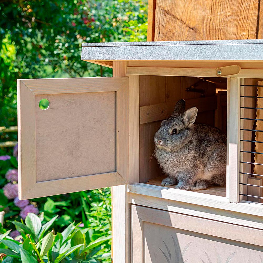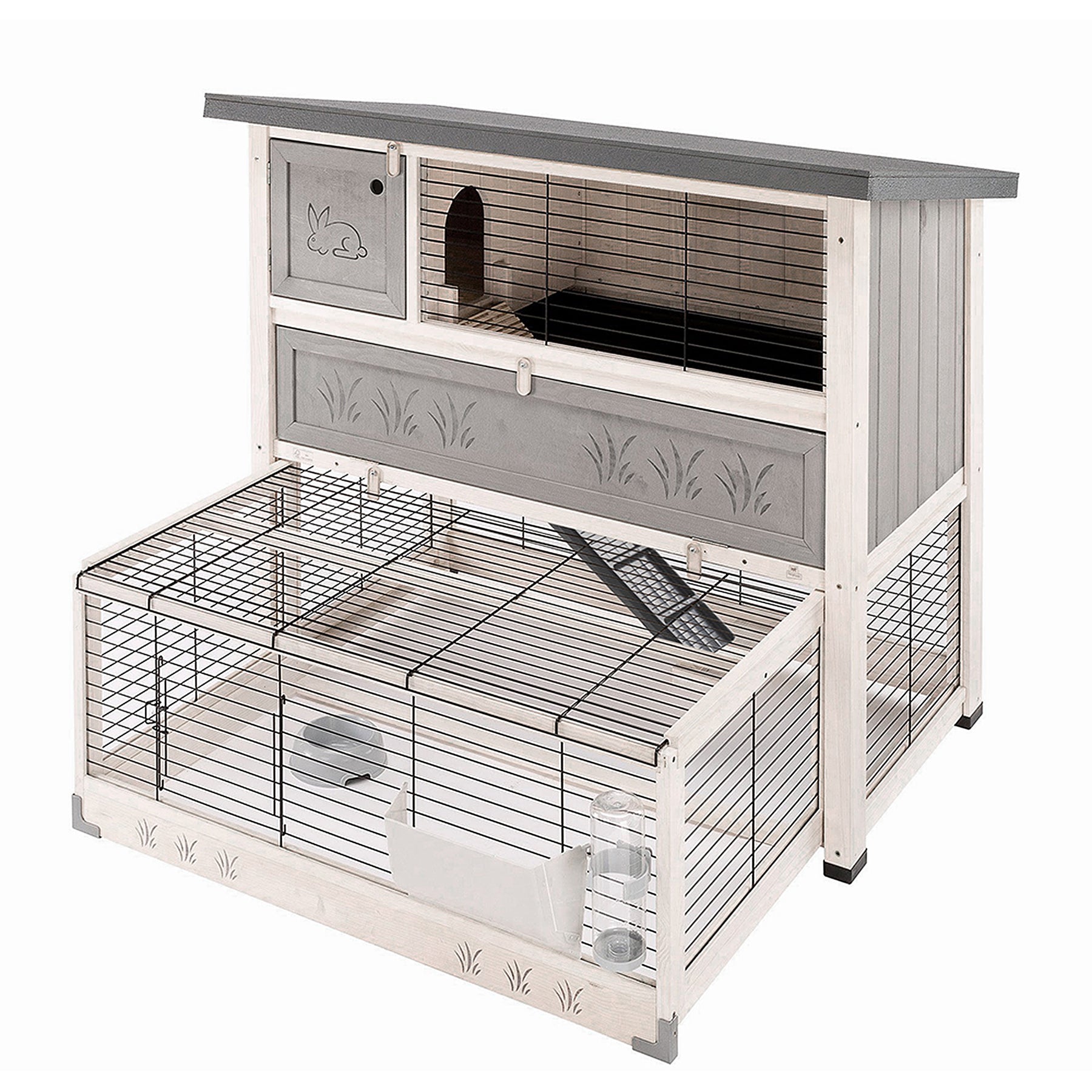 On the ground floor, for example, perfect for daytime activities, you will find a pen delimited by a sliding wire net which allows you to double the space and the living comfort available to the friendly rodent. The pen has a sliding door with safety closing hook, fully accessorised with a plastic feeder, drinking bottle, bowl for food and ladder to enter the upper floor, dedicated instead to night activities or any daytime rest. This quieter area is equipped with a large plastic bottom ideal to contain the litter and a wooden ramp that gives access to a comfortable rabbit house. The house has a openable front door and it is also equipped with a safety lock.