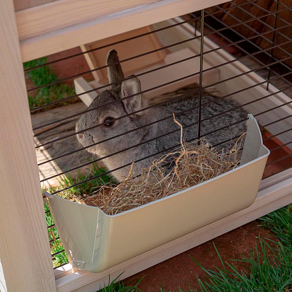 - The upper floor has roomy poo trays made of plastic with high walls, removable from the outside and protected by a door