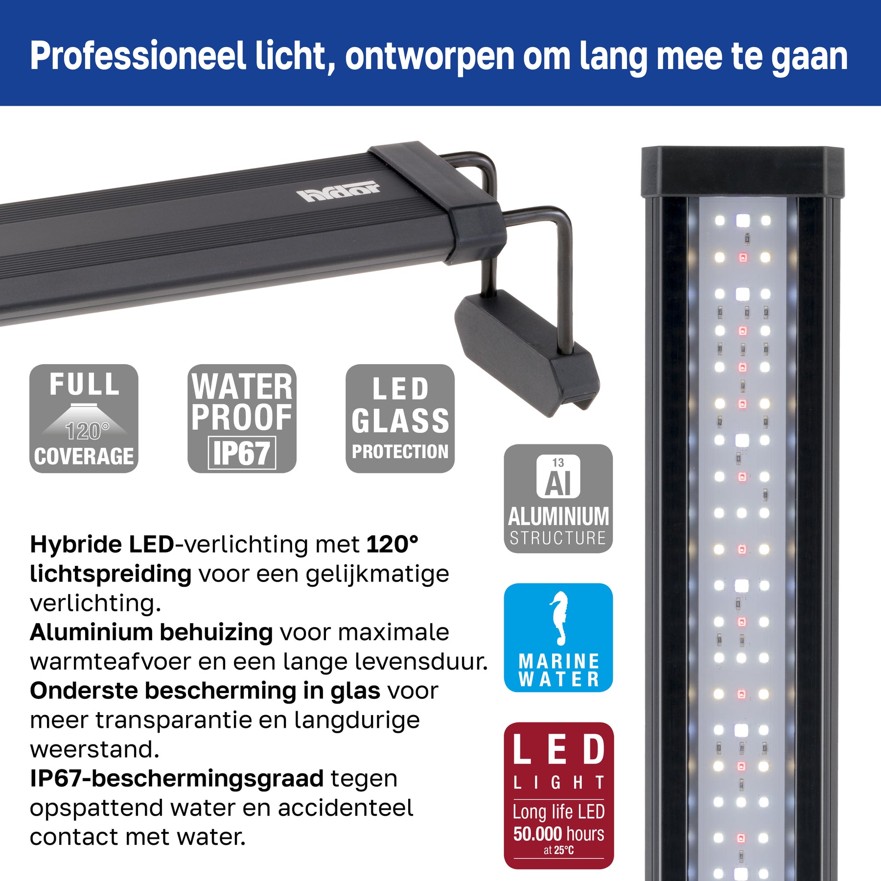 Projetada tanto para uso profissional quanto doméstico, a lâmpada LED AQ-LUX REEF é fabricada com materiais resistentes que garantem durabilidade e segurança ao longo do tempo. O corpo de alumínio assegura uma dissipação eficiente do calor, mantendo o desempenho constante e evitando o superaquecimento dos LEDs. A tampa de vidro resistente a riscos é fácil de limpar. Com proteção IP67, a lâmpada é resistente a respingos de água e imersões acidentais no aquário. Com vida útil de até 50.000 horas, esta lâmpada LED para aquários é uma solução de baixo consumo energético, ideal para garantir uma iluminação estável e duradoura.