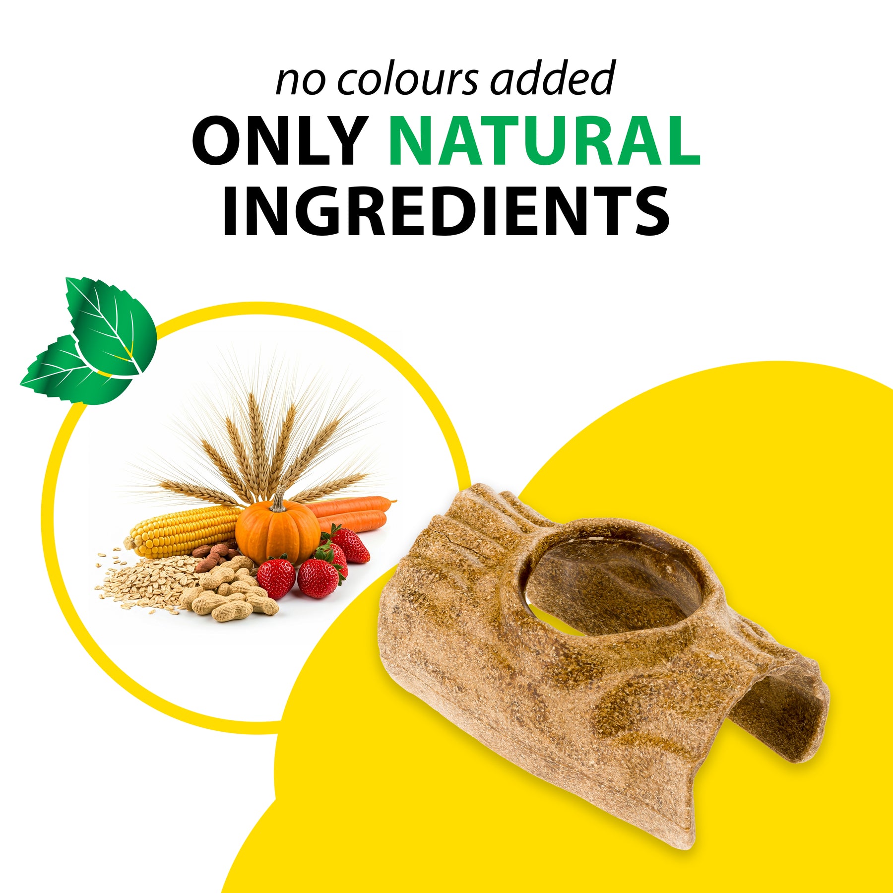 Produzido exclusivamente com ingredientes de origem vegetal, Veggie Bites Tronco é sem açúcares adicionados e sem corantes artificiais. As cores naturais derivam de ingredientes vegetais como abóbora e outros componentes de origem vegetal. O elevado teor de fibras permite uma utilização regular no contexto de uma alimentação equilibrada para pequenos animais herbívoros.
