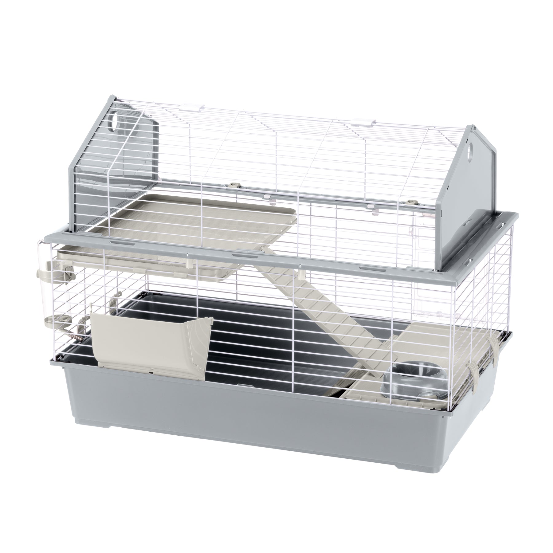 O Barn 100 lembra um celeiro americano graças à forma do teto elevado! Confortável e espaçosa, esta gaiola para coelhos tem uma grande superfície utilizável: no piso inferior encontra-se uma casinha, perfeita para momentos de relaxamento. Uma escada de plástico conduz ao andar superior, onde podemos encontrar a sala de estar para o animal. O habitat está equipado com acessórios essenciais como comedouro, tigela e bebedouro.
