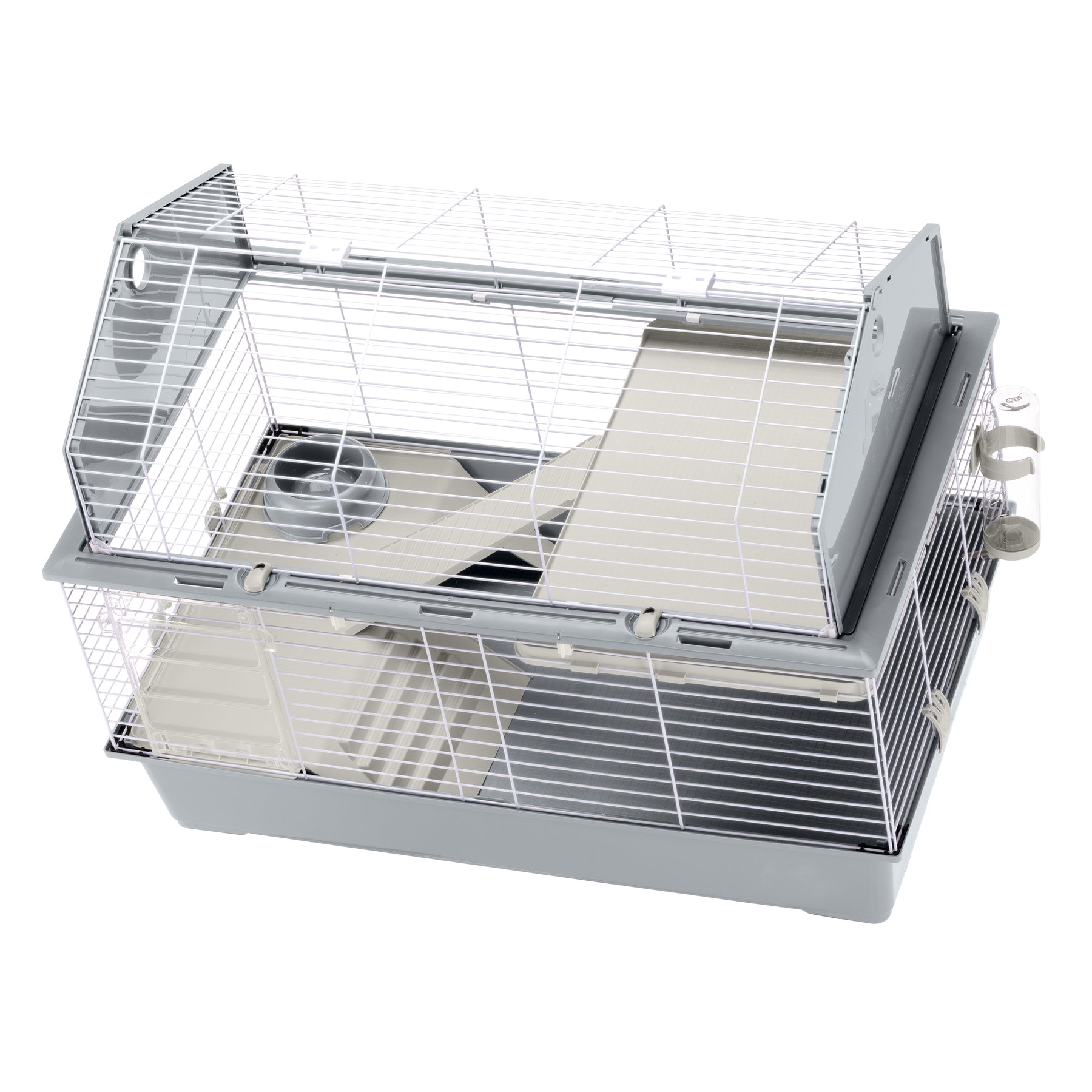 A gaiola pode ser totalmente desmontada, reduzindo seu volume na hora de guardar. É composta de uma rede metálica pintada resistente e de uma base de resina termoplástica que contém sujeira, areia e resíduos de comida com eficiência. Na parte frontal, foi montada uma confortável escada que permite que o pequeno animal entre e saia com autonomia.