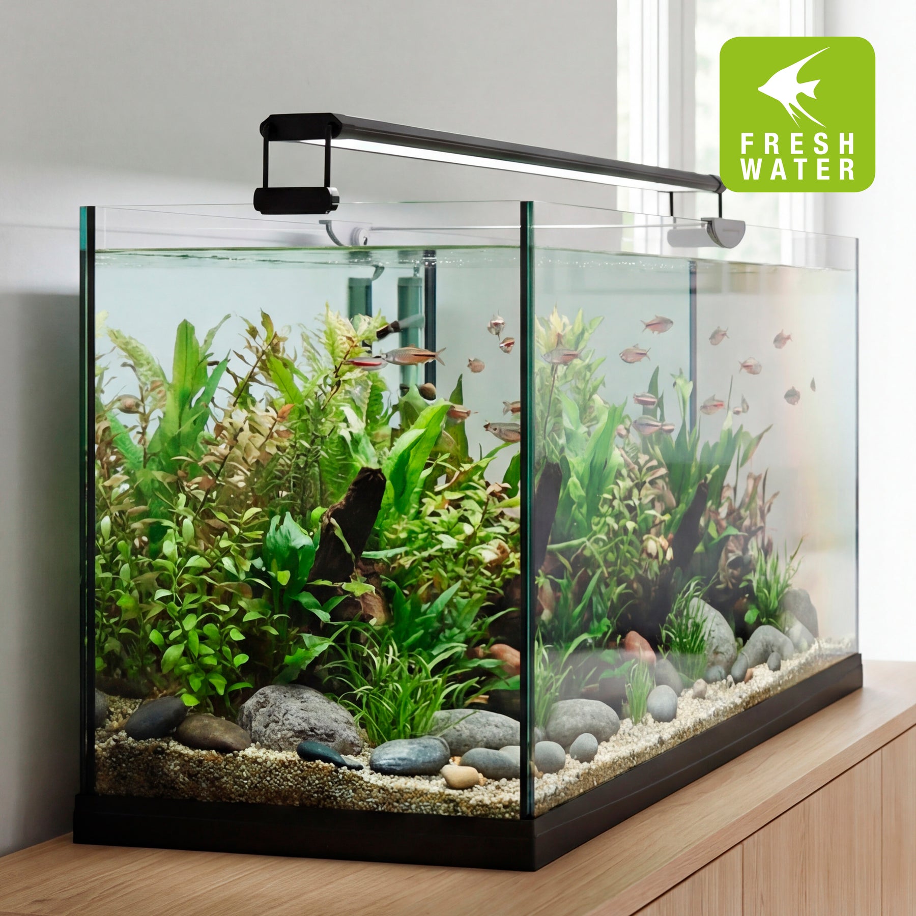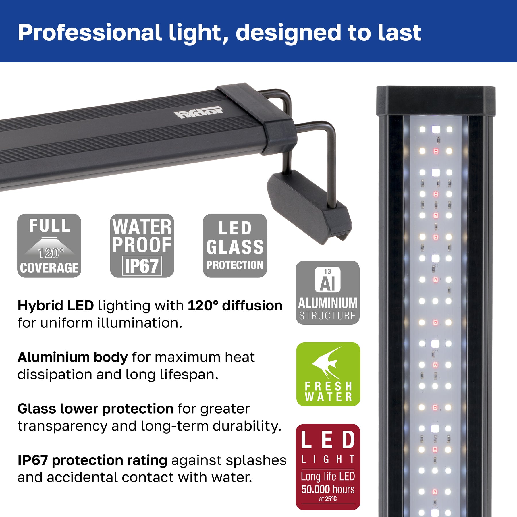 - Alta fidelidade cromática (CRI – Índice de Reprodução de Cor >90), para uma visão detalhada e cores vibrantes que destacam a beleza do aquário de água doce
