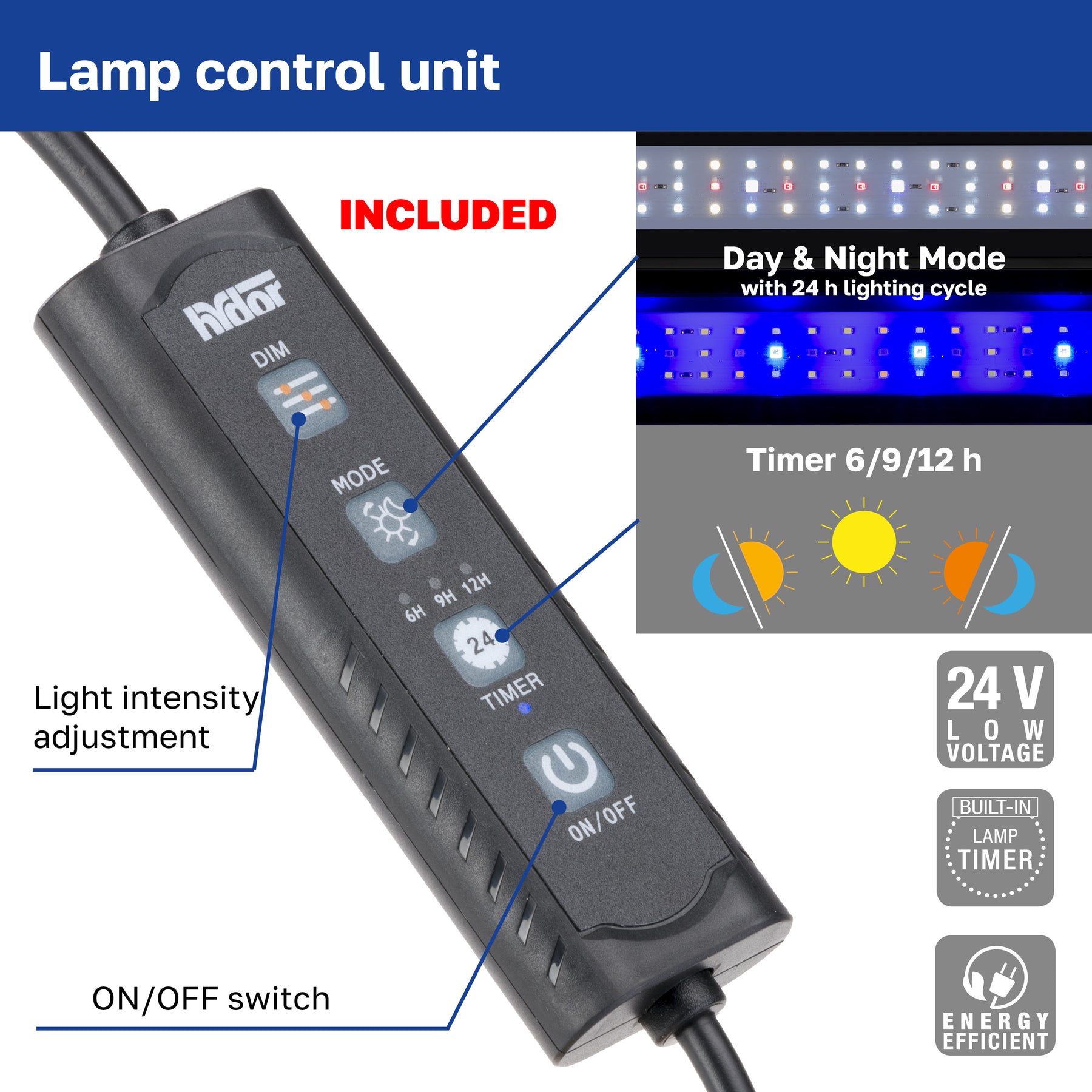 - Dimmer para ajustar a intensidade luminosa de acordo com as necessidades específicas do aquário