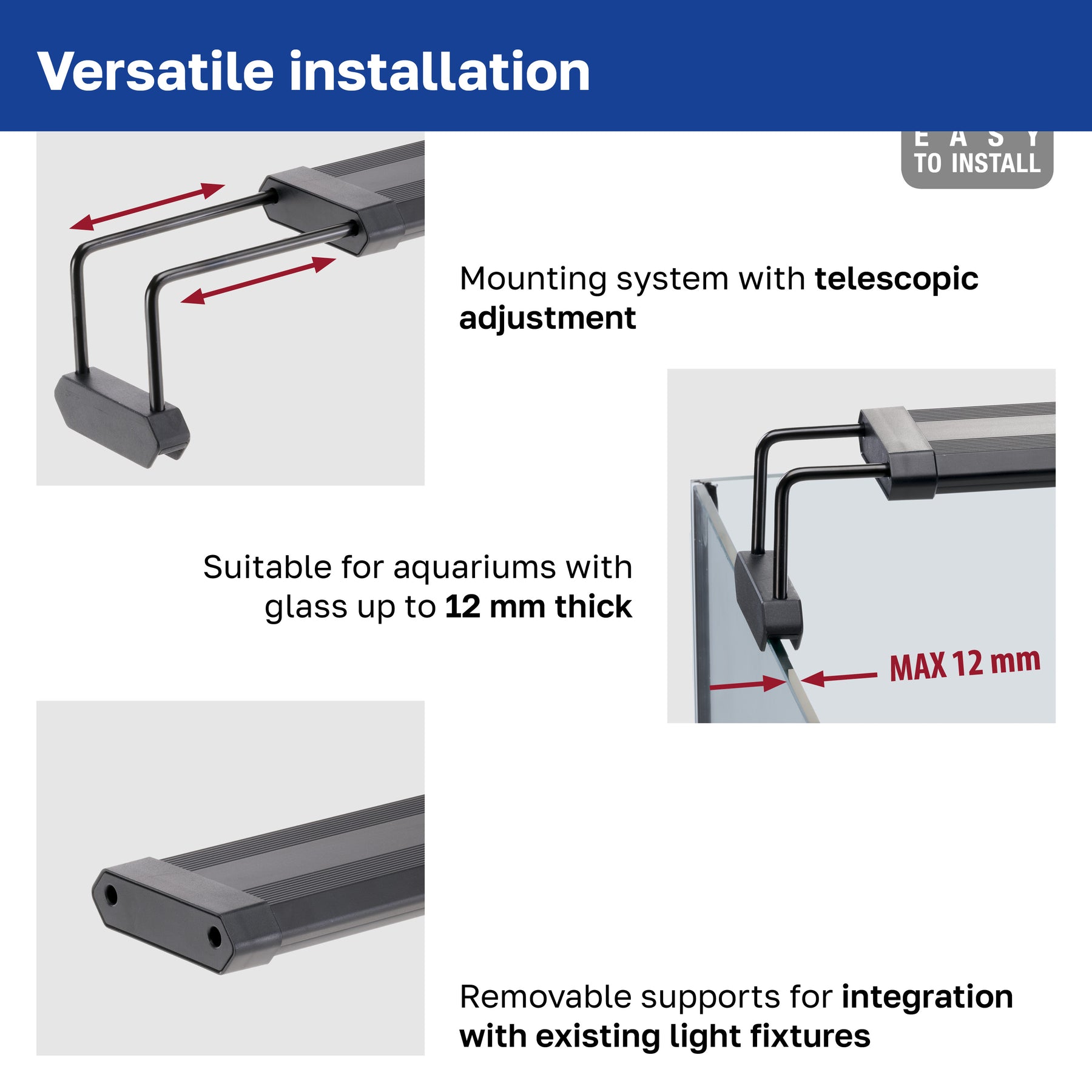 - Suportes extensíveis e removíveis, ajustáveis para se adaptarem a aquários abertos com vidros de até 12 mm de espessura