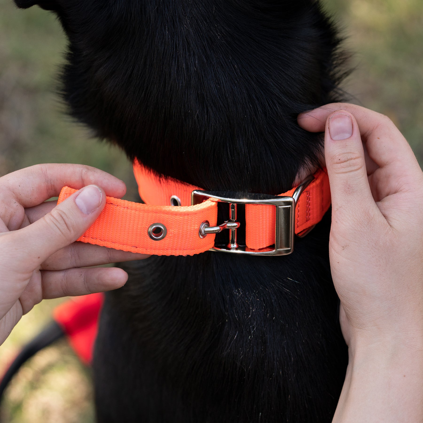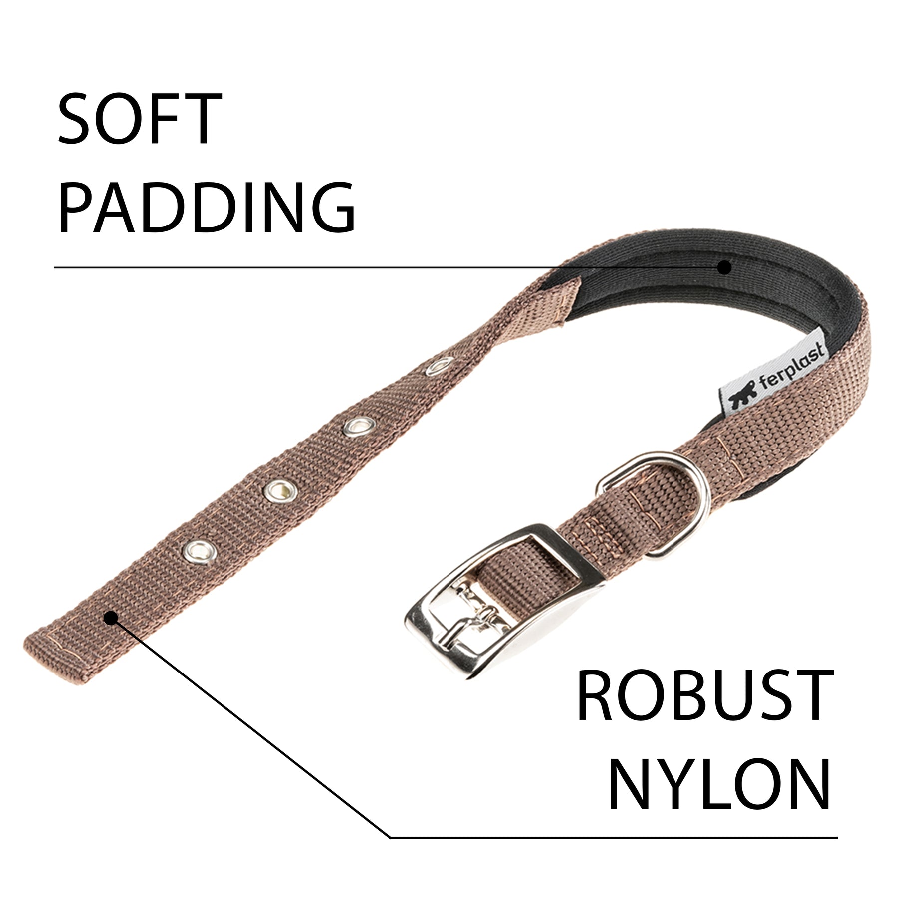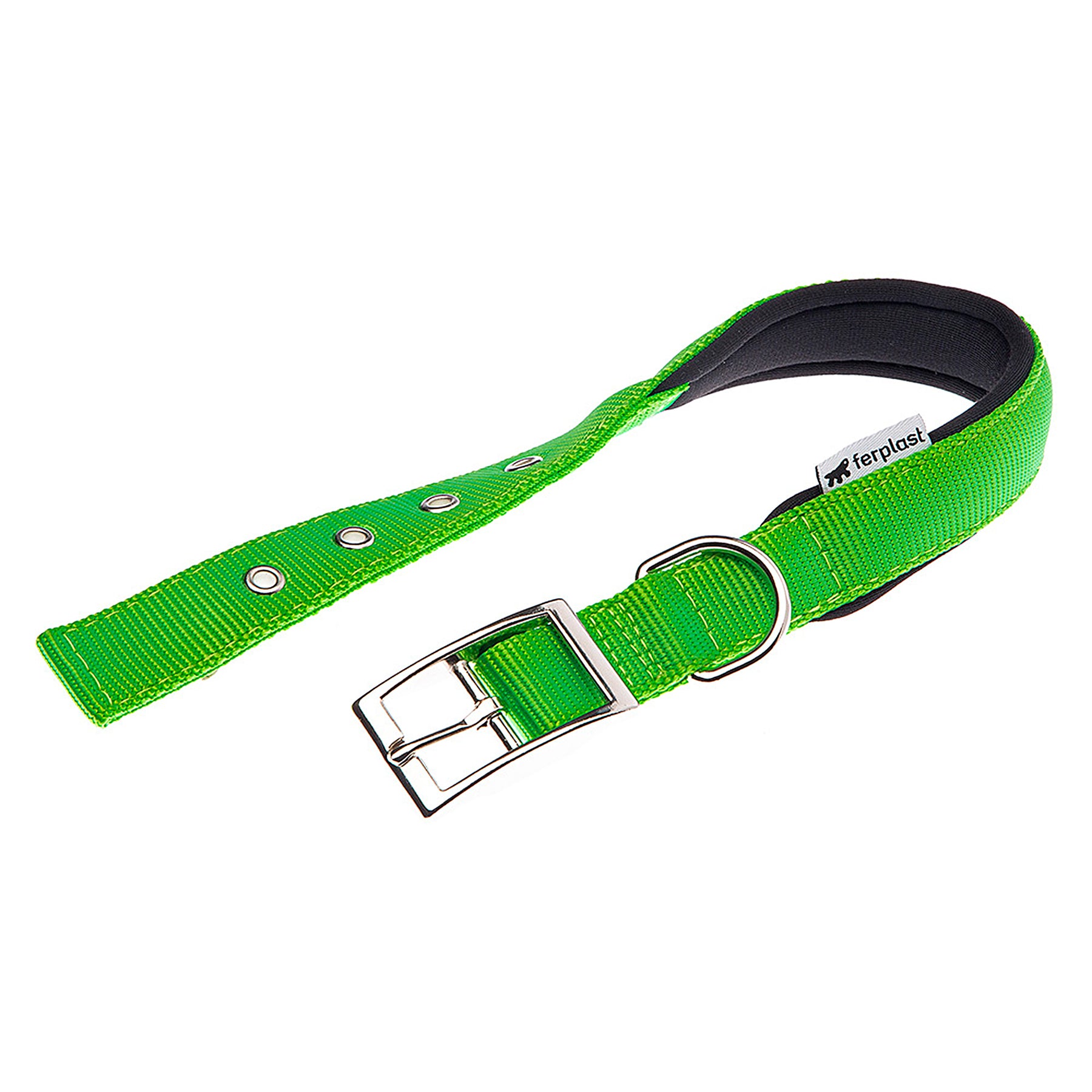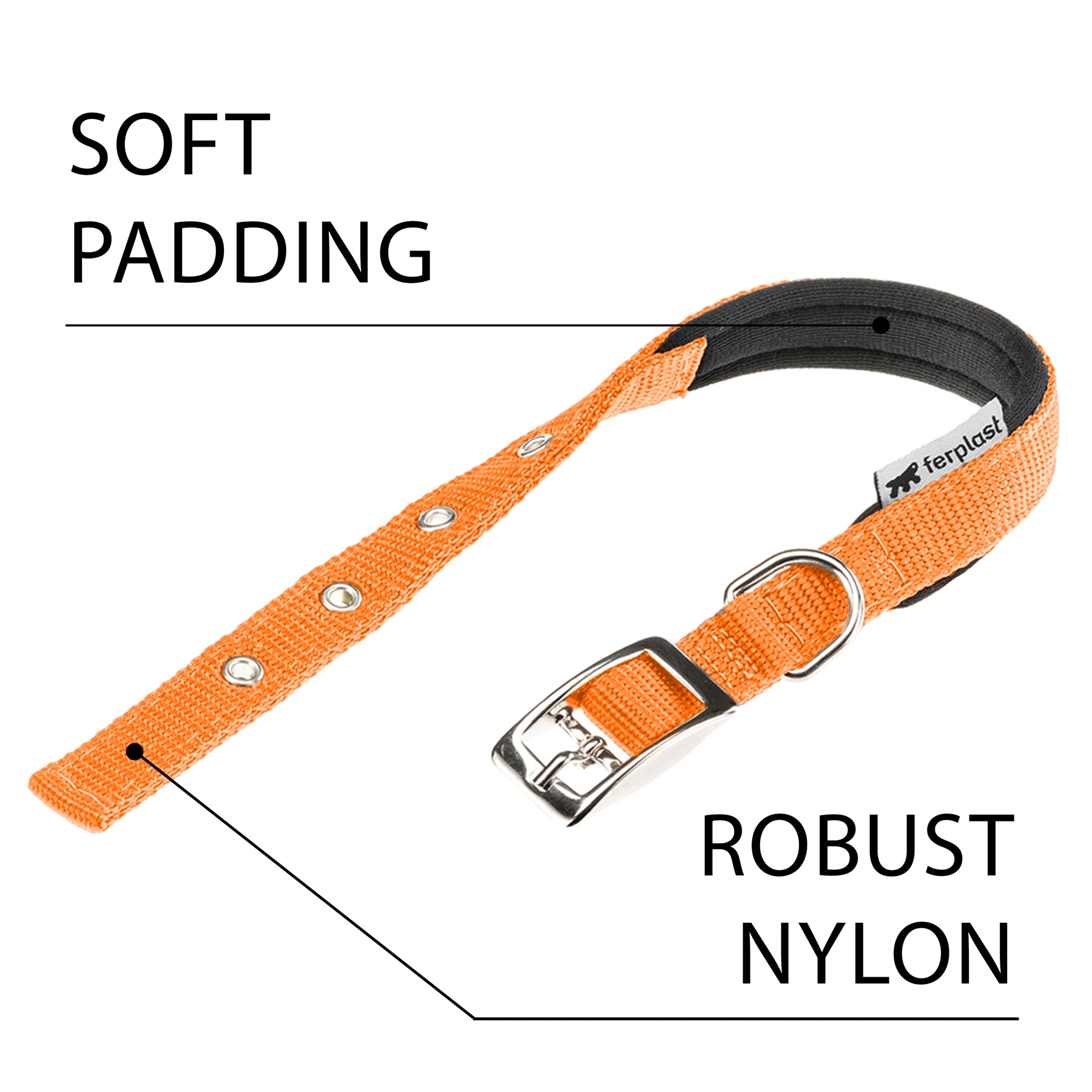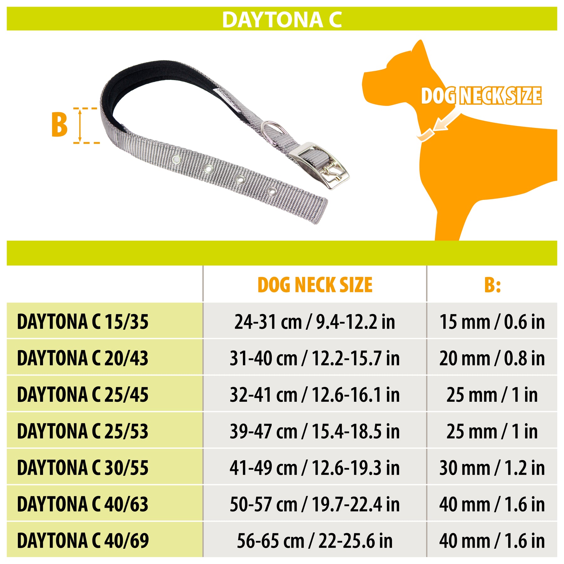 Muito confortável no pescoço do seu amigo de quatro patas graças ao acolchoamento macio que reveste o interior, Daytona C é uma coleira confeccionada em nylon, material que a torna particularmente resistente ao estresse do animal. Ajustável através dos quatro furos, possui uma robusta fivela de metal cromado que garante um fechamento eficaz e seguro. Para se adaptar a todos os tamanhos de cães, o Daytona C está disponível em vários tamanhos, com circunferência que varia de um mínimo de 27 a um máximo de 69 cm e uma largura da alça que varia de 15 a 40 mm. Esta gola pode ser escolhida em uma ampla gama de cores.