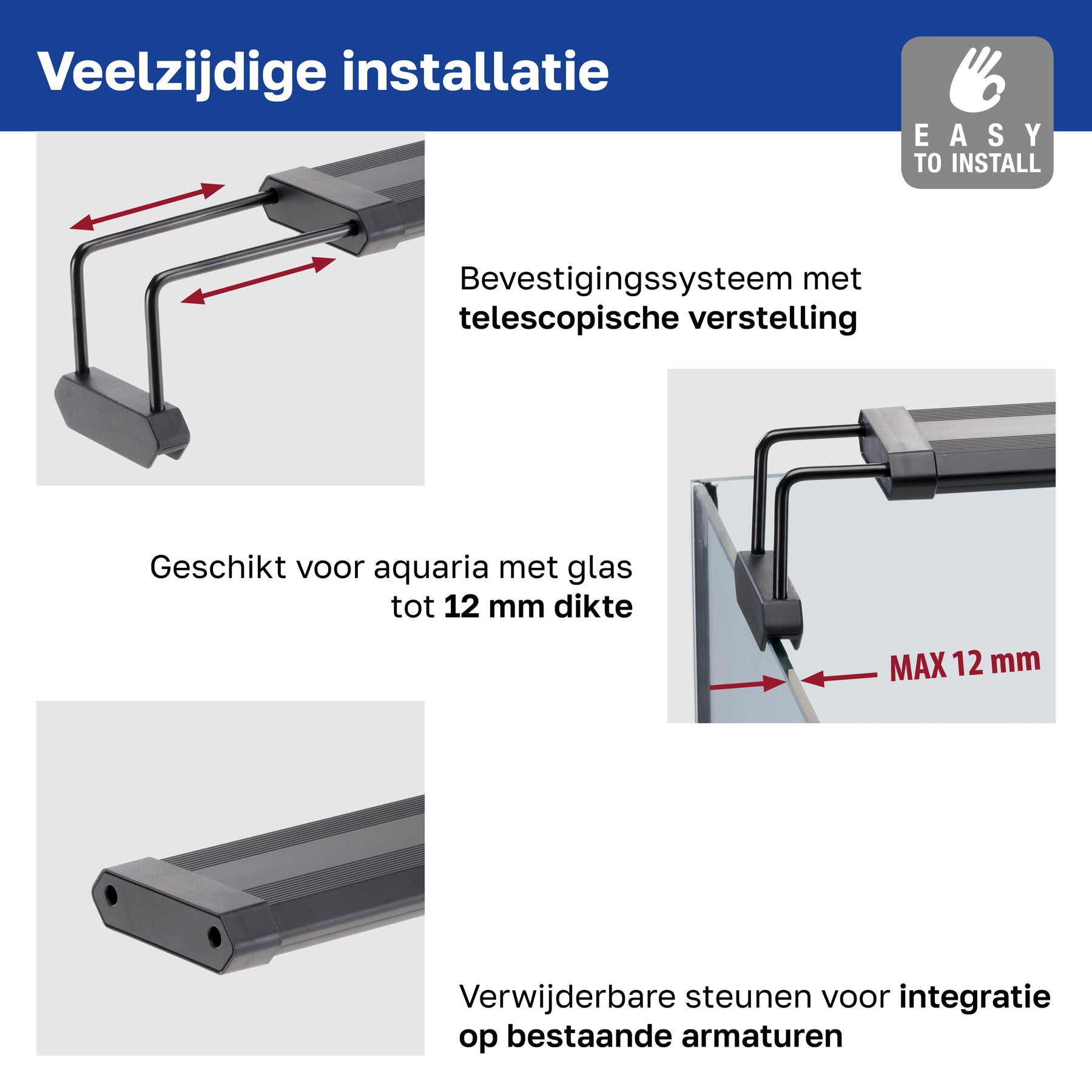 - Suportes extensíveis e removíveis, ajustáveis para aquários abertos com vidros de até 12 mm de espessura