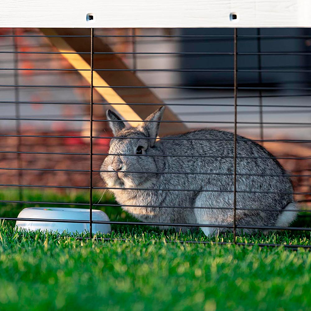 Sólidas e resistentes, as gaiolas para coelhos Grand Lodge são divididas em diferentes ambientes projetados para atender a todas as necessidades do pequeno animal e garantir o máximo conforto em qualquer hora do dia. No andar térreo, há um cercado metálico com uma rampa que permite ao animal entrar e sair livremente. Na parte frontal, há uma prática portinhola deslizante, equipada com um sistema de travamento projetado para garantir a segurança do seu animal. O cercado vem com um comedouro para feno, um bebedouro e uma tigela para comida. Uma rampa interna conecta os dois andares: o andar superior possui um fundo amplo, ideal para conter a caixa de areia, e uma confortável casinha de madeira, que serve como refúgio perfeito para o descanso. A casinha tem uma rampa de acesso que também pode ser usada como porta de fechamento.