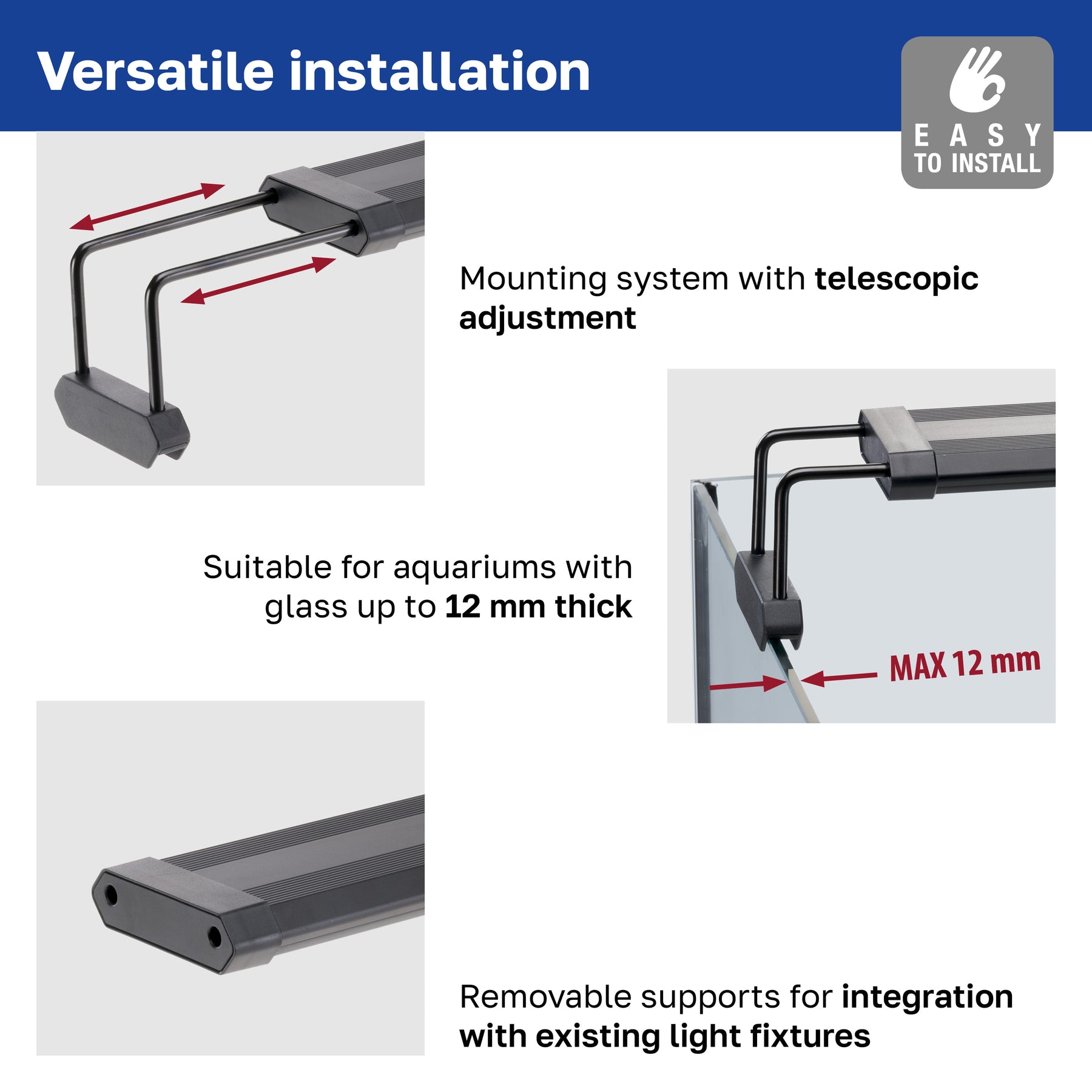 - Suportes extensíveis e removíveis, ajustáveis para aquários abertos com vidros de até 12 mm de espessura