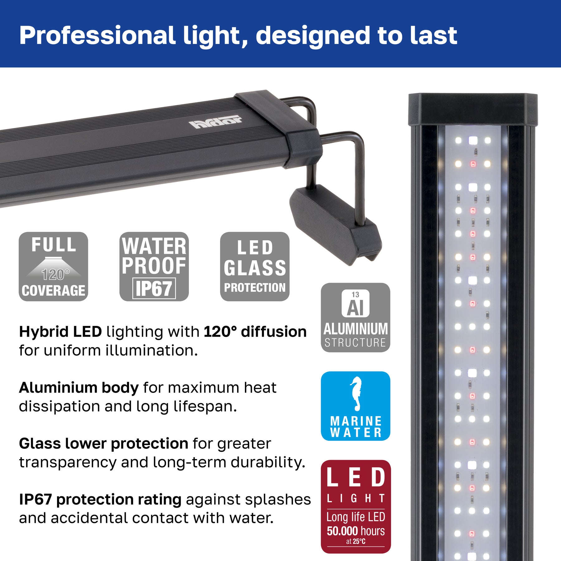 Projetada tanto para uso profissional quanto doméstico, a lâmpada LED AQ-LUX REEF é fabricada com materiais resistentes que garantem durabilidade e segurança ao longo do tempo. O corpo de alumínio assegura uma dissipação eficiente do calor, mantendo o desempenho constante e evitando o superaquecimento dos LEDs. A tampa de vidro resistente a riscos é fácil de limpar. Com proteção IP67, a lâmpada é resistente a respingos de água e imersões acidentais no aquário. Com vida útil de até 50.000 horas, esta lâmpada LED para aquários é uma solução de baixo consumo energético, ideal para garantir uma iluminação estável e duradoura.