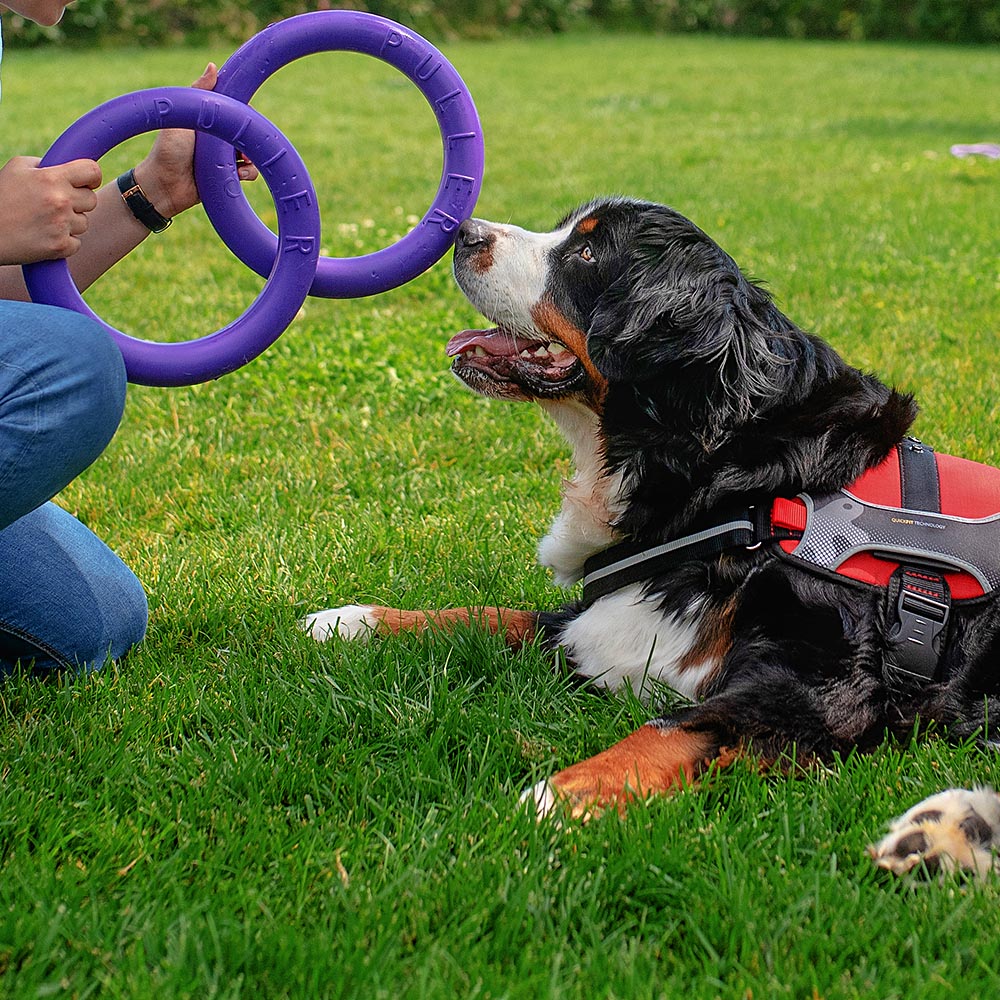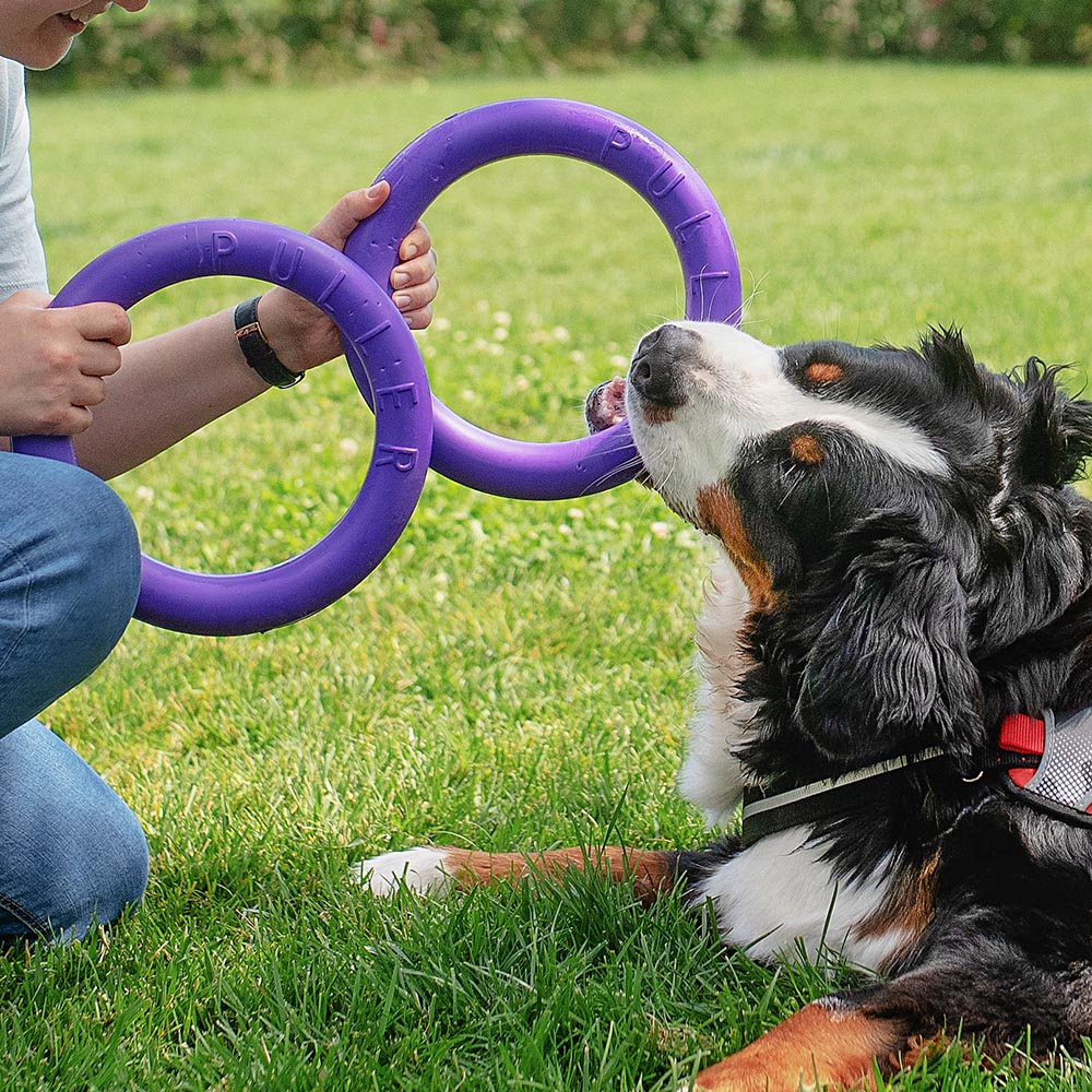 CORRER: o cão busca os anéis PULLER e os traz de volta um por um. Se seu cão não quiser dar o anel de volta, mostre o outro para ele. O exercício treina o cão a recuperar um item e ajuda no desenvolvimento de velocidade e agilidade. PULAR: O cão pula e pega o PULLER. Uma vez que o cão agarra o anel, dê o outro a ele. O exercício treina a atenção do cão e habilidades de reação. PUXAR: o cão puxa os anéis PULLER um por um. O exercício melhora a força e resistência do cão.