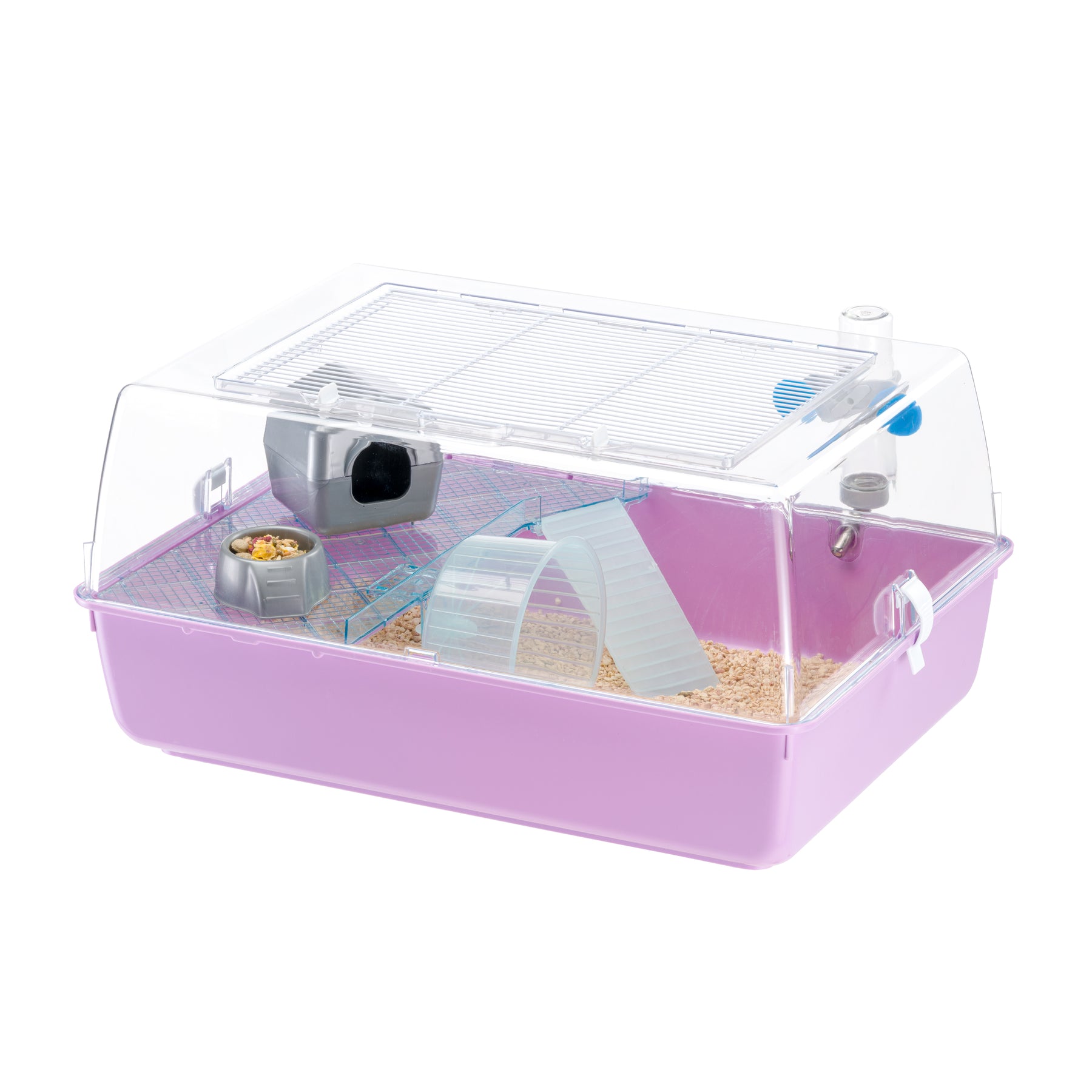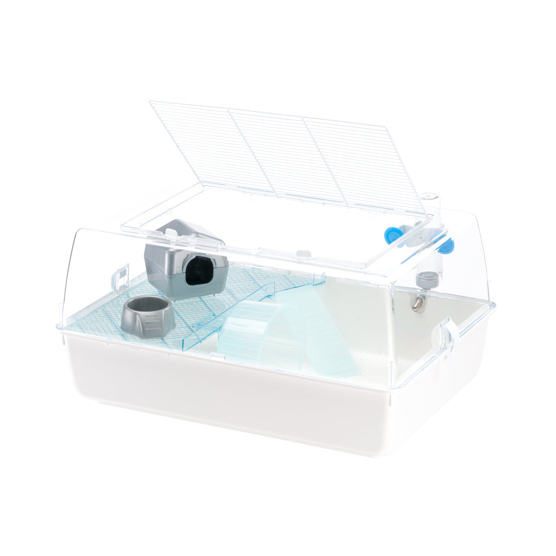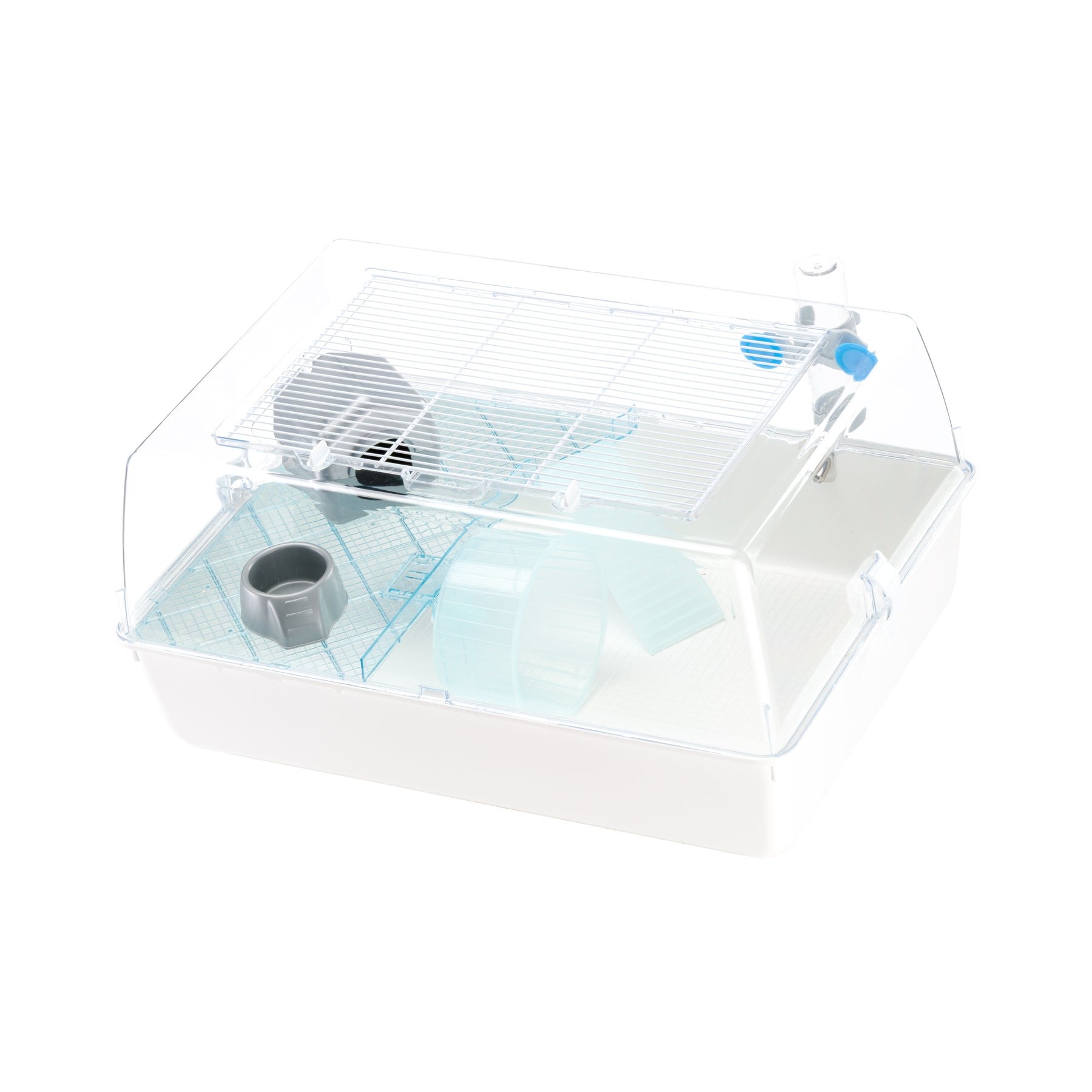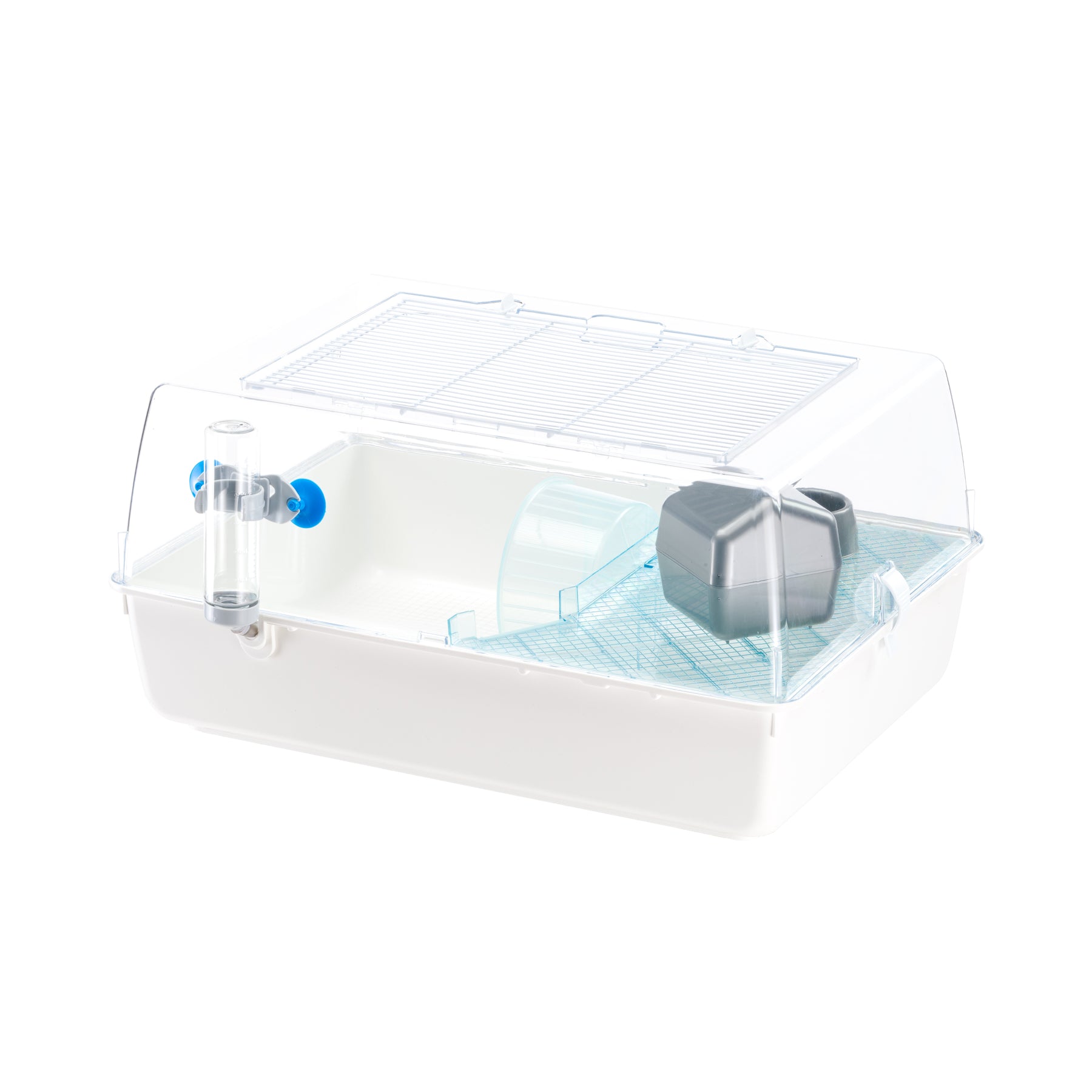 Mini Duna Hamster - клетка для хомяков из прочного пластика, с прозрачной крышей и металлической решеткой на крыше для обеспечения отличной циркуляции воздуха, которую можно полностью открыть на время уборки. Клетка оборудована прозрачной голубой полочкой из пластика, которая позволяет вам наблюдать за вашим питомцем. В комплект также входят другие аксессуары, среди которых маленький домик, пластиковая миска, поилка с присосками, лесенка и колесо.