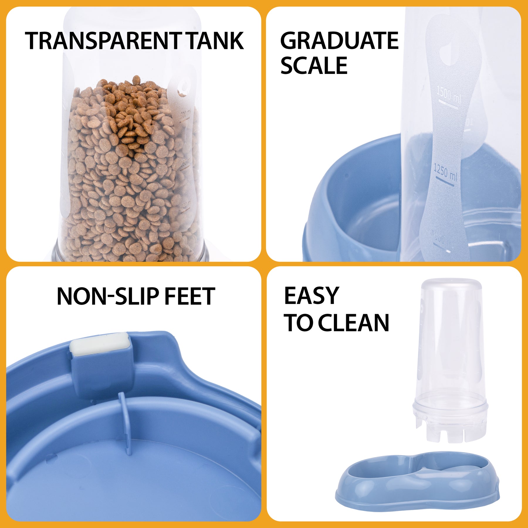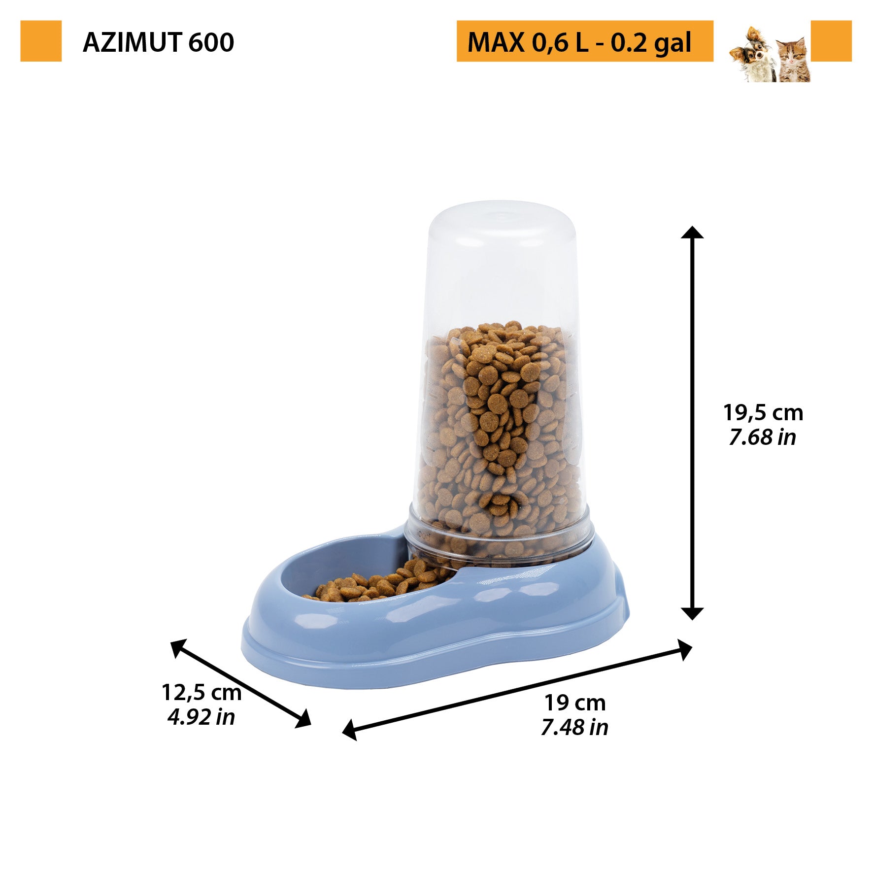 Azimut - механическая пластиковая кормушка для сухого корма и воды для кошек и собак. Оснащена антискользящим покрытием и имеет прозрачный резервуар со шкалой в литрах. Благодаря специальной форме кормушку удобно брать, это идеальный аксессуар для кошек, щенков и маленьких собак. В наличии два размера: 0,6 л и 1,5 л.