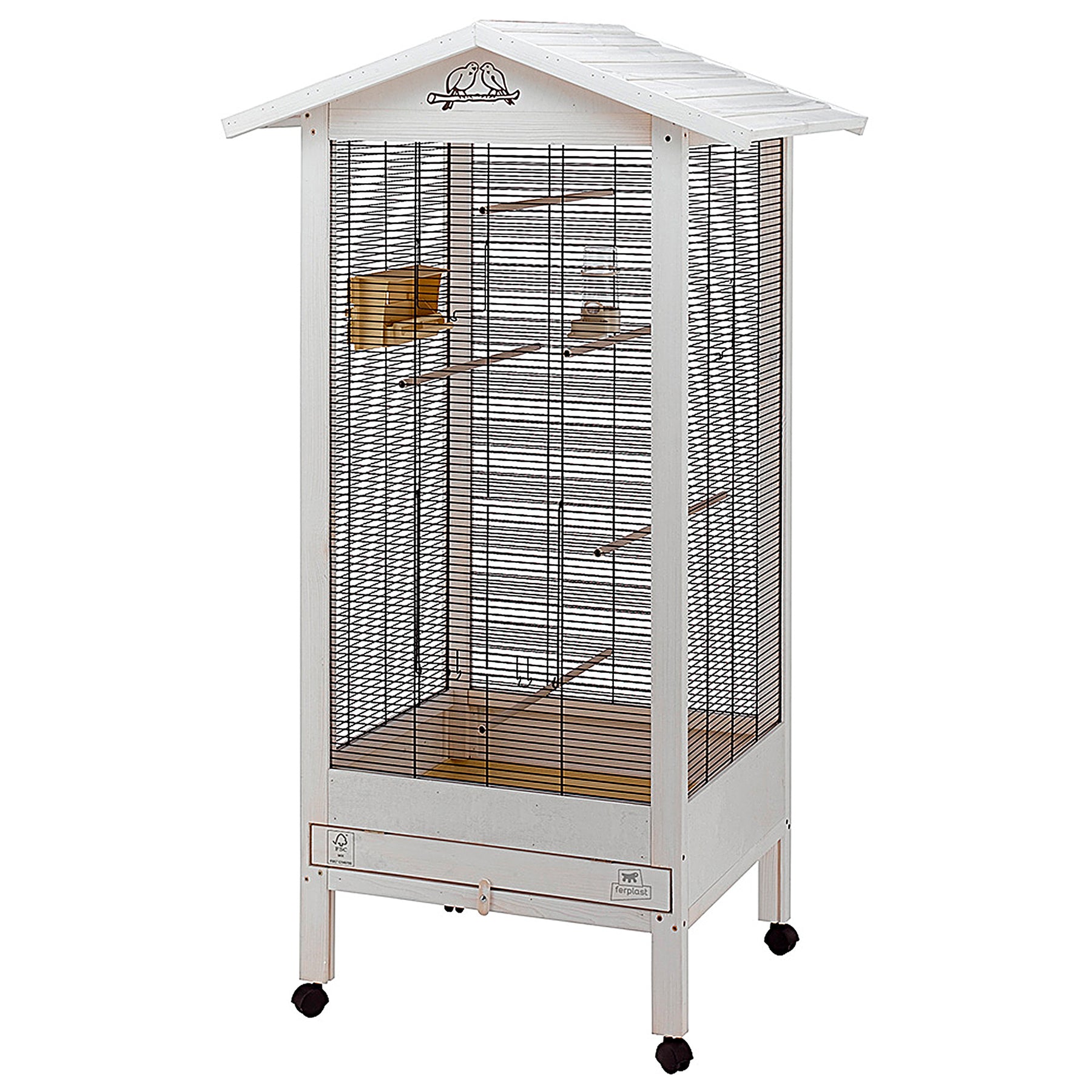 Hemmy是适合饲养金丝雀,鹦鹉和异国情调的鸟类的优雅鸟舍,由木头制成,并且在前端有精致的小鸟装饰。 木材是经过FSC™ 认证的,仅来自根据严格的环境、社会和经济标准、负责地管理的木材; 经过特殊的无毒,防霉抗紫外线涂料处理,并采用“流涂”工艺进行涂装,以提高使用寿命。 金属丝网由坚固的涂漆金属制成。 Hemmy是经过精心设计的现代木制鸟舍,精致柔和的配色,并配有满足多只鸟生存的需求。